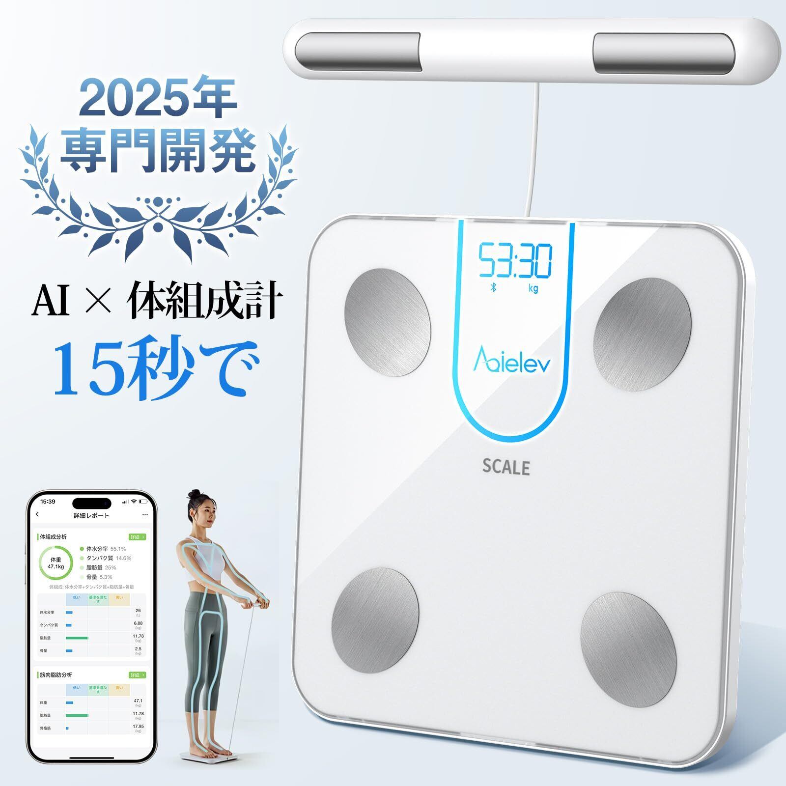 【特別価格】AQielev 体重計 スマホ連動 体組成計 体脂肪率【2025年春 専門開発 45項目・八電極 双周波による全身部位別測定】米国トップ会社と共同開発 高度専門化されたヘルスメーター 最先端高精度BIAセンサー 15 秒で迅速測定 体重・体脂肪率の測定精度は99.99% 自動ON/OFF iOS/Android対応 充電式 収納簡単 一家一台 PSE認証済み 日本語取扱説明書