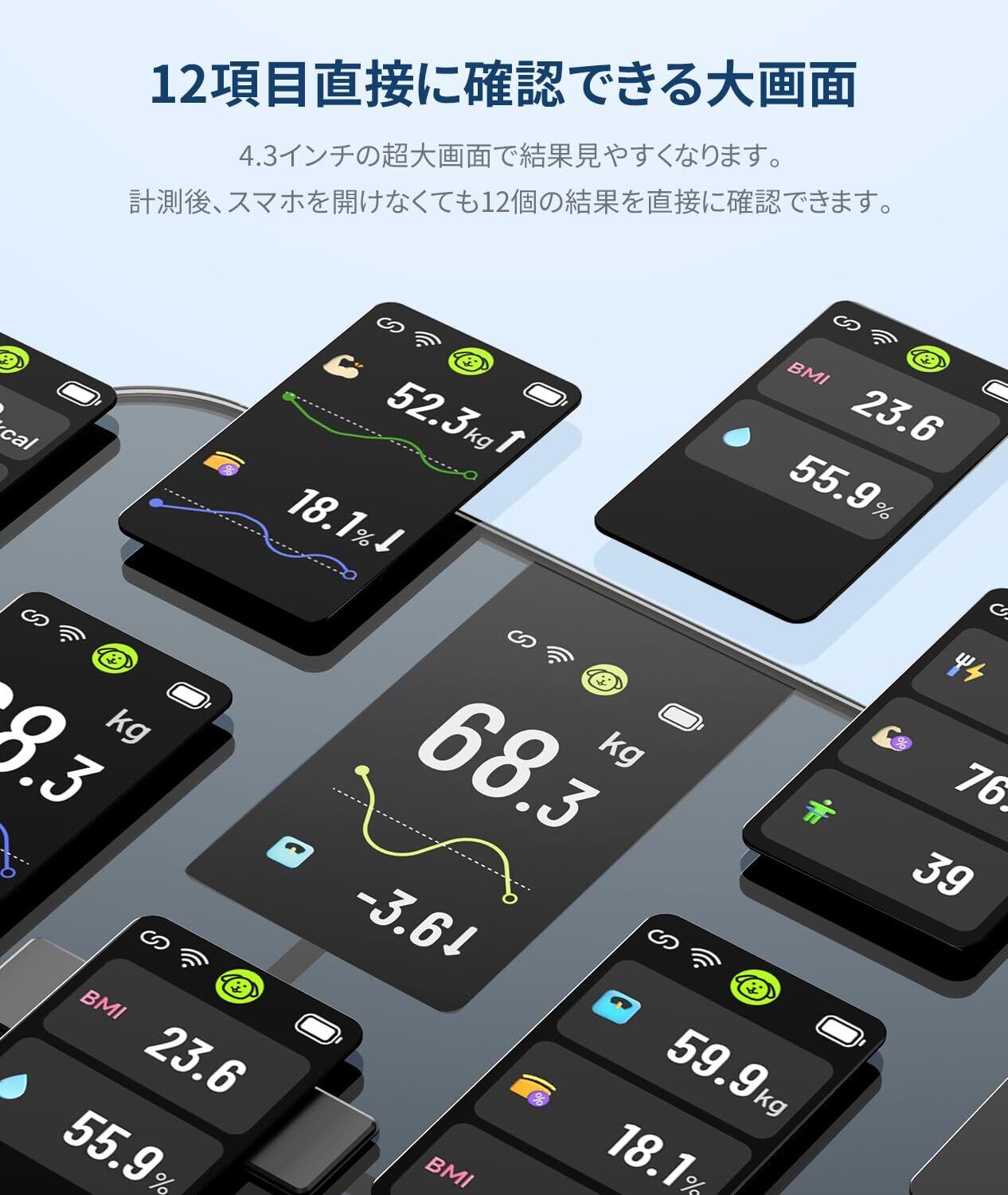 【高解像度大画面で12項目直接に確認】体組成計業界先端の4.3インチの超大スクリーンを採用し、カラー画面で、結果見やすくなります。3~12項目の表示が自由に設定できます。計測後、スマホを開かなくても結果を直接に確認できます(ご注意:初めて使う場合、スマホとバインドして登録する必要があります。そうしないと、体重しか表示されません)。