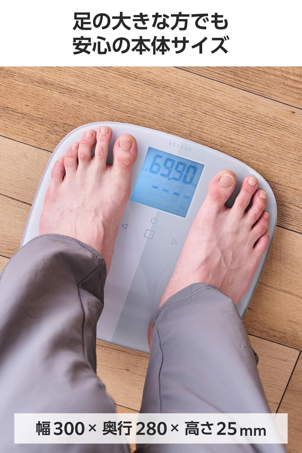 MRI測定データに基づき腹部全体の内臓脂肪を算出する体積推定方式を筑波大学と共同で開発。 より正確に内臓脂肪レベルの評価ができる“ECLEAR体組成計”です。 50グラム単位の精密な測定が可能で、内臓脂肪レベル・基礎代謝など8項目を測定可能。※100kgを超えると100g単位となります。