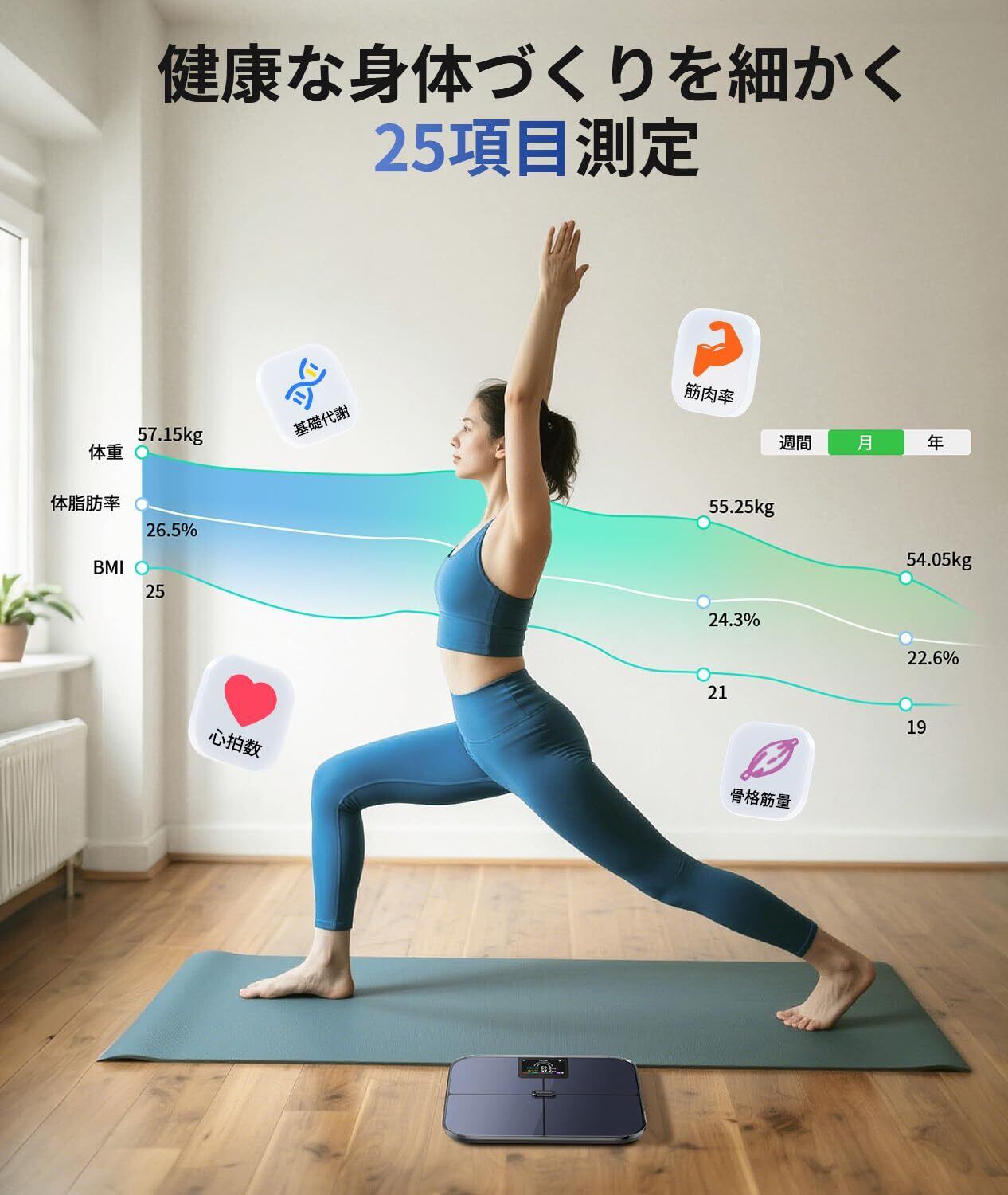 【健康状態を25項目でまるごとチェック】体重やBMI、体脂肪率といった基本データはもちろん、心拍数・筋肉量・骨量・体年齢・皮下脂肪率まで、カラダの内側までくまなく分析。「見える化」されたデータで、あなたの健康管理がもっとスマートに、もっと確実に。