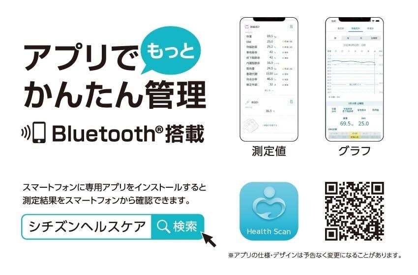 【Bluetooth搭載 専用アプリで測定結果をかんたん管理】スマートフォンに専用アプリ「Health Scan(ヘルススキャン)」をインストールすると日々の測定結果を管理することができます。