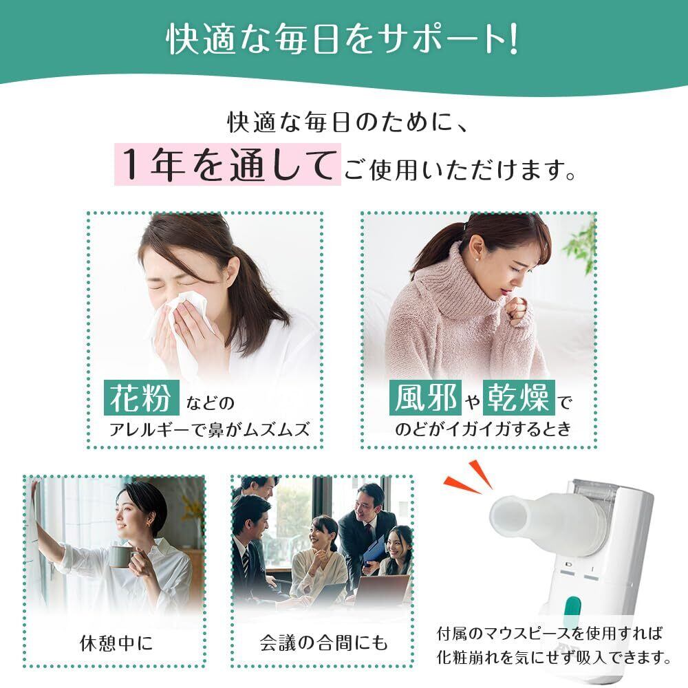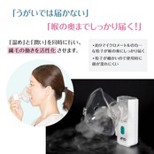 【超音波式の吸入器で喉ケア】超音波方式で暖かいミストなので、むせずに吸入ができます。約9マイクロメートルのスチームが喉の奥まで届き、鼻や喉の加湿と洗浄で不快感を和らげます。
