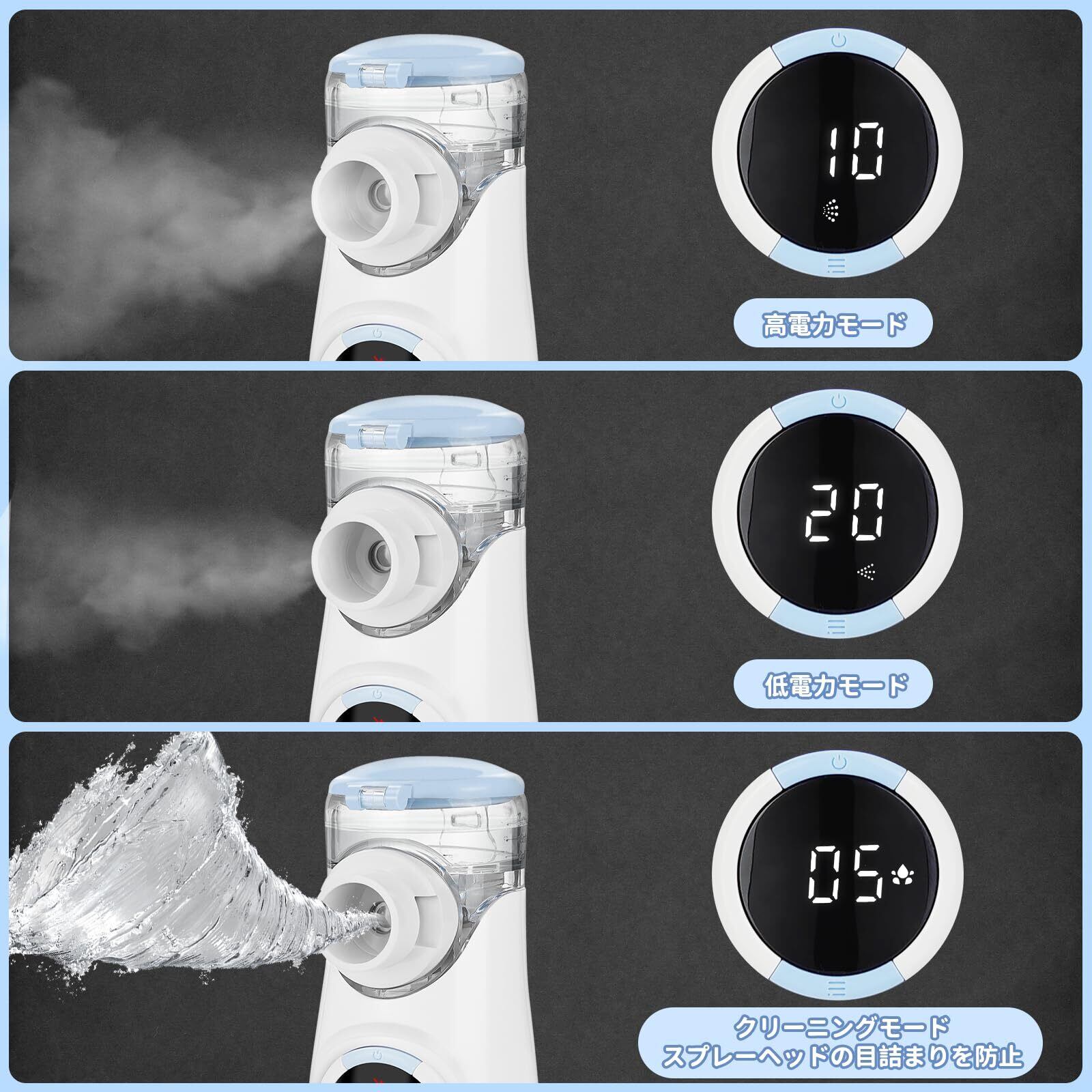 【クリーニング機能】使用後は薬瓶に残った薬液を洗浄する必要があります。メッシュスプレーヘッドの穴の直径はわずか3μmであるため、残液が固化してノズル穴を塞いで、正常に使用できなくなります。本製品にはクリーニング機能が付いており、薬瓶を洗浄・消毒した後、適量のお水(精製水や蒸留水は使用不可)を加えてクリーニングモードに切り替え、メッシュスプレーヘッドを洗浄します。スプレーヘッドに残液が残らないようによくご確認ください。また、機器を洗浄する際に、直接に水をかけて洗浄しないでください。