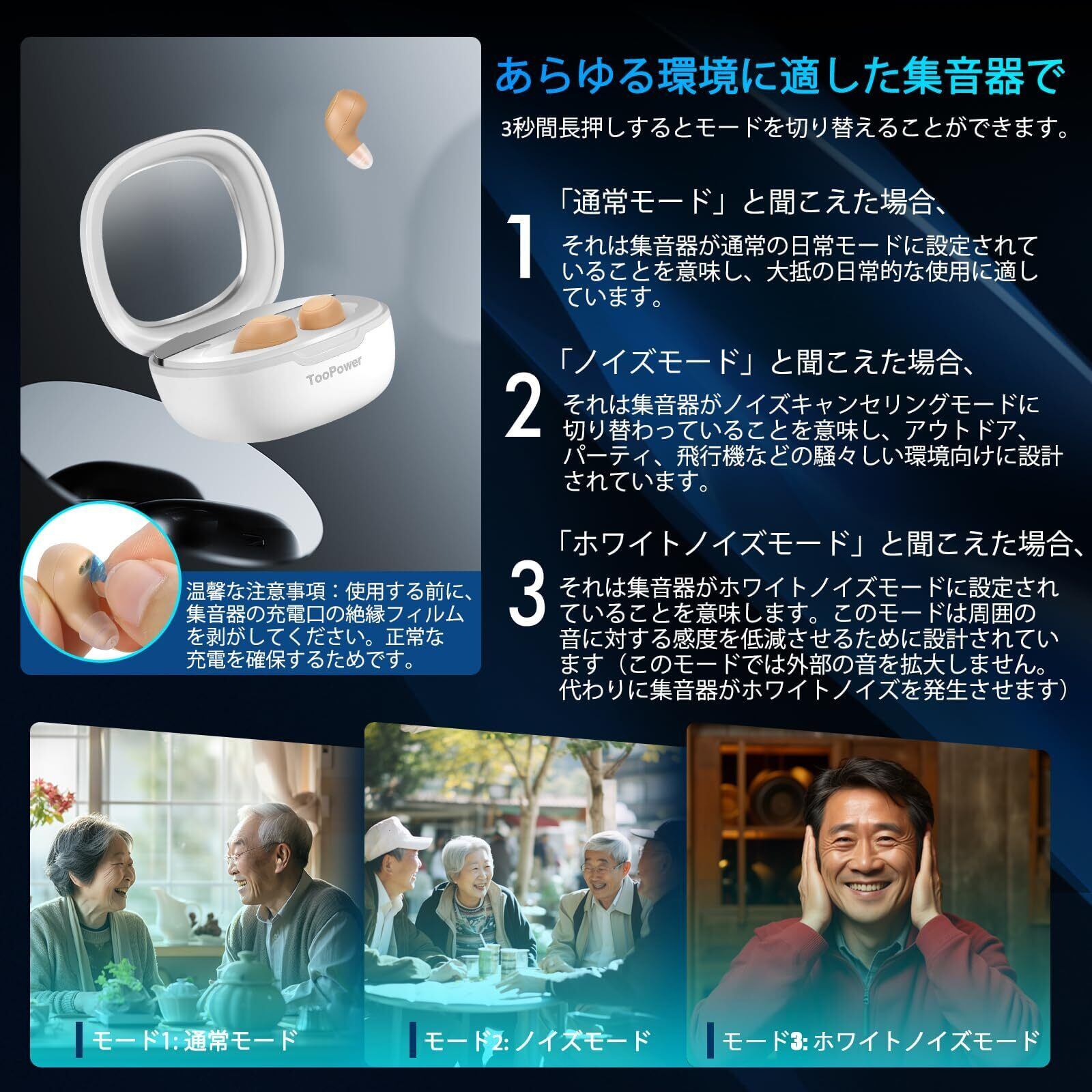 【防止ホイッスル機能】TooPower高齢者集音器はホイッスル防止機能とイヤーディテクション機能を備えています。装着後の最初の3秒間は、ホイッスル音を防ぐためにバッファ期間がアクティブになります。快適な使用や装着時における経験をします。