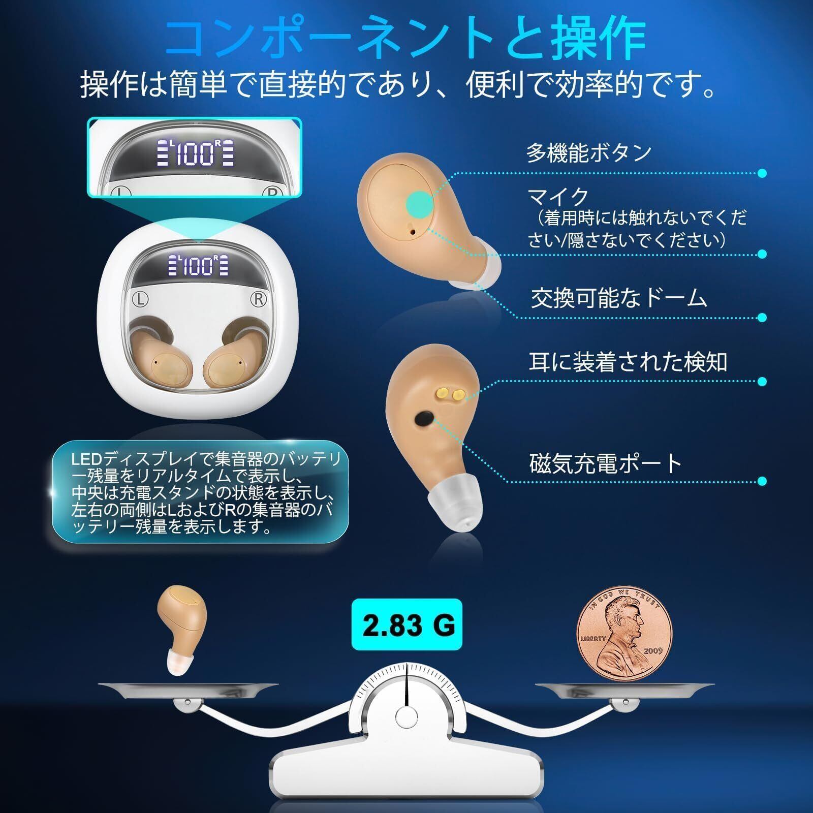 【ミニ集音器、両耳に対応】TooPower集音器は革新的な半耳内方式で設計されており、耳に密着して快適に装着でき、落下のリスクもありません。外観は自然でスタイリッシュであり、ほとんど目立ちませんので、心配することなくご使用いただけます。軽量なデザインで、重量はわずか2.83グラムです。パッケージには3サイズのソフトラウンドチップが含まれており、自分の耳に合ったものを簡単に見つけることができます。左耳または右耳に装着し、左右の音量を独立して調整することができ、非常に便利です。