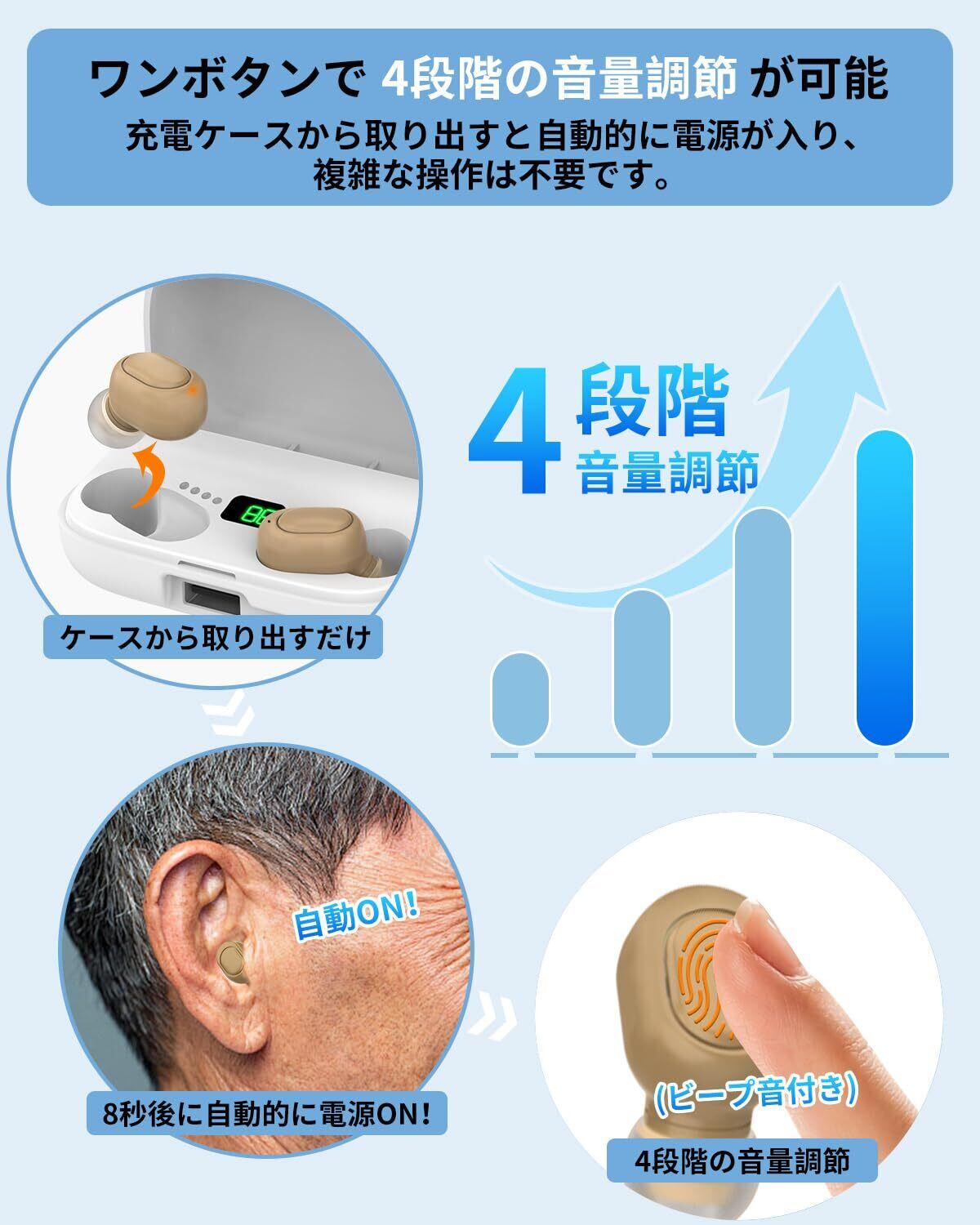 【高齢者に優しい簡単操作】指先で軽くタッチだけで4段階の音量調整が可能、操作時には確認音が鳴るため、音の回数で確認できます。最新のデジタルノイズリダクション技術により、環境音を抑えつつ、話し声やテレビの音声をクリアに増幅(最大35dB)―大切な『音』をを守り、「聞こえにくさ」によるストレスや不安を軽減します。軽度~中度の方に設計となっております。【ご購入前に必ずお読みください】集音器の特性について、「選択的増幅」ができないため、会話音声だけでなく、環境音(車両音/風音/生活音等)にも拡大されます。静かな室内での使用にしてください。この特性は全ての集音器に共通する構造上の特徴です。