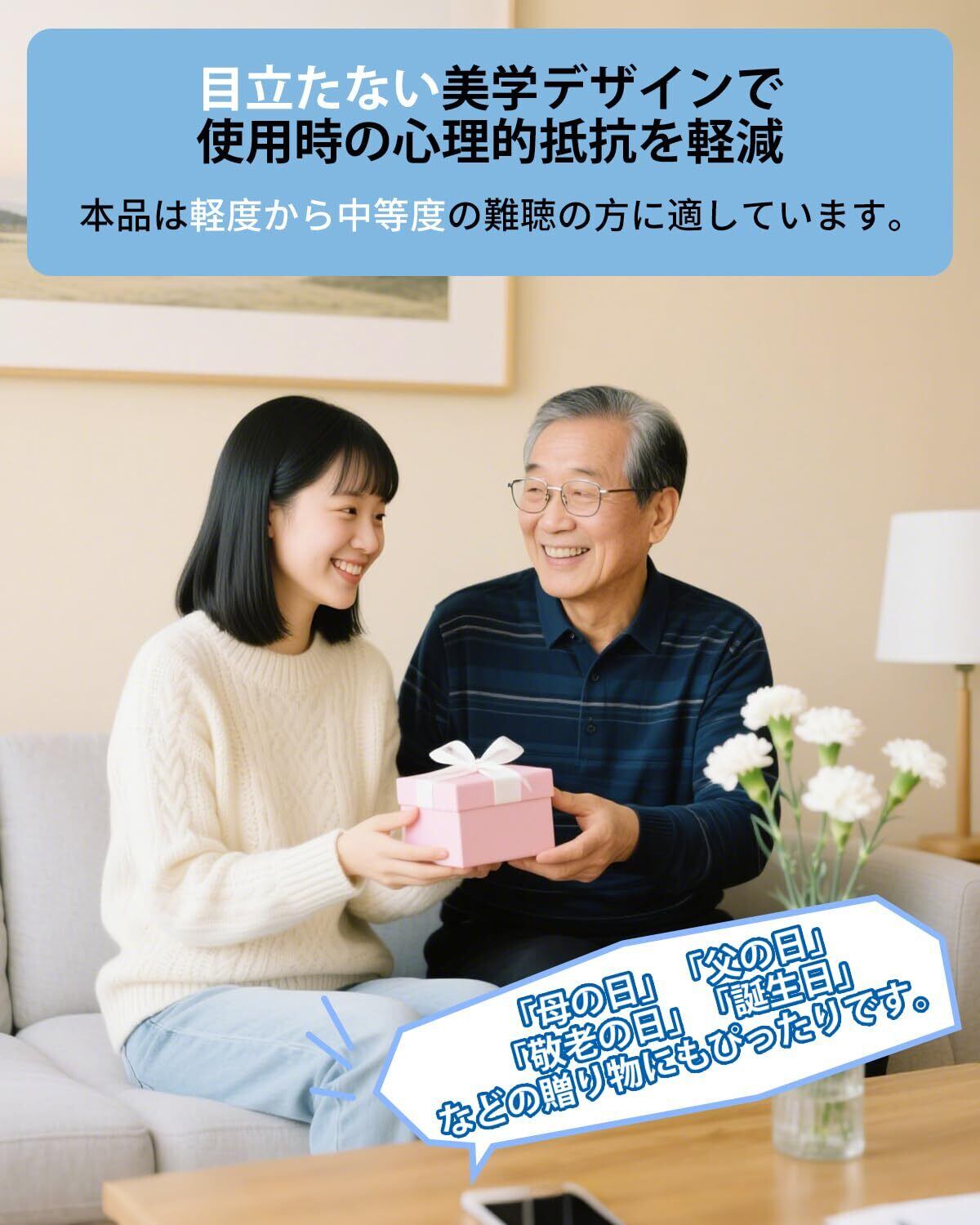 【1年間の品質付き! プレゼントにもいい】セット内容:集音器本体、充電ケース、3サイズ(S/M/L)のソフトイヤーピース、クリーニングブラシ、日本語マニュアル、Type-Cケーブルが同梱。「母の日」「父の日」「敬老の日」「誕生日」「結婚記念日」など、人生の節目となる特別な日にぴったりです。安心の1年品質 & 24時間カスタマーサポートを提供、万が一の際(ハウリング、ノイズなど)は無料交換・返金対応!どんなお悩みやご質問にも、親切丁寧にお応えします。