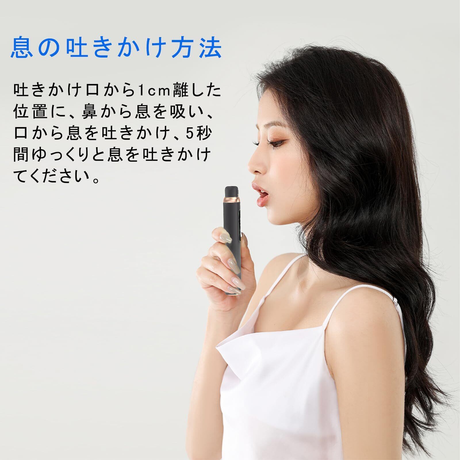 【測定方法】センサー部を飛び出します。電源ボタンを3秒間長押しして電源を入れ、製品は予熱ための9秒カウントダウンに入ります。予熱が完了すると、本体が振動し、青色のインジケーターライトが点滅し、測定状態に入ります。測定状態で、唇を吹きかけ口に近づけ、1cmの距離を保ち、5秒間息を吐きかけます。