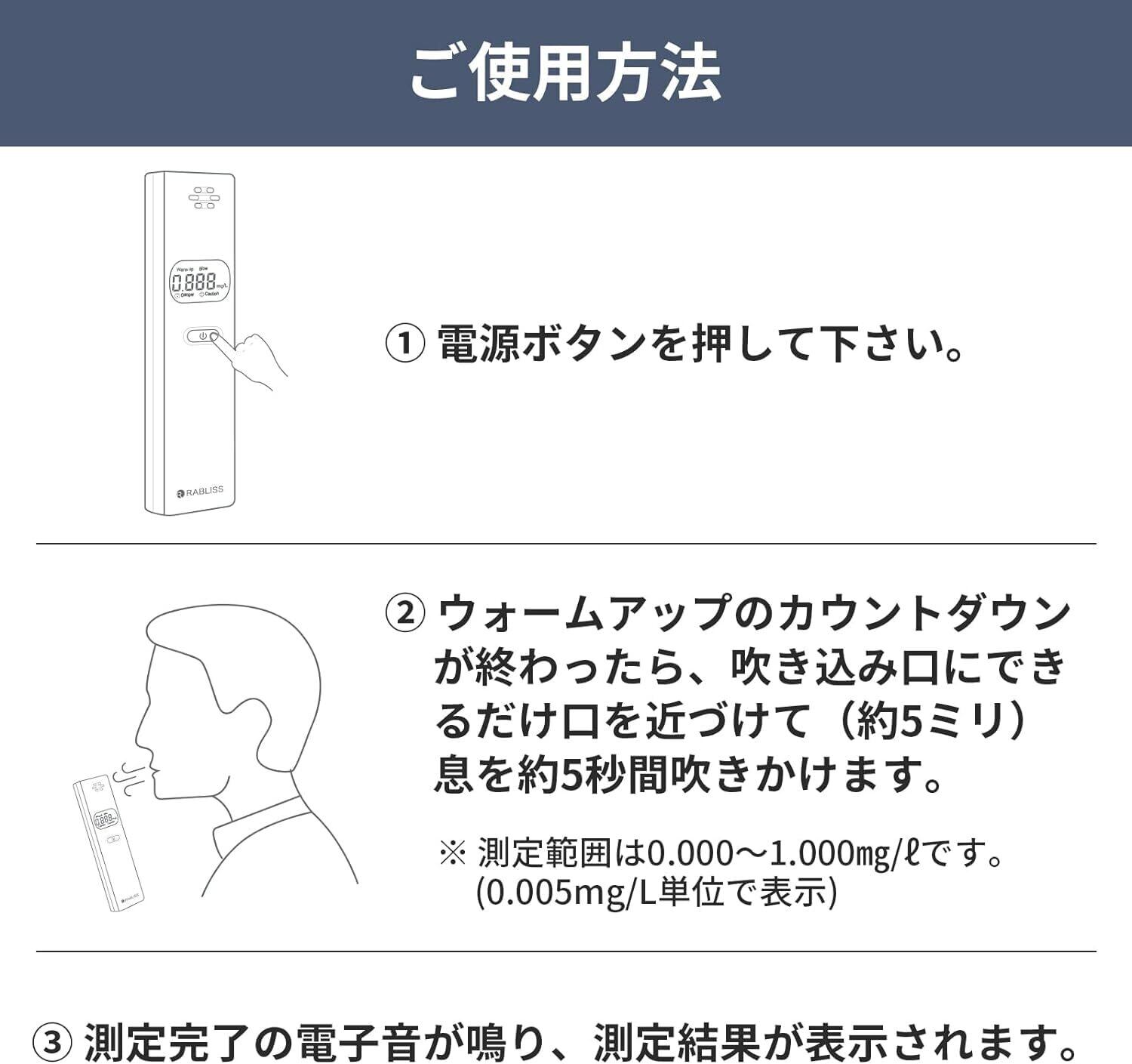 【使用方法】1. 電源ボタンを押して下さい。2. ウォームアップのカウントダウンが終わったら、吹き込み口にできるだけ口を近づけて(約5ミリ)息を約5秒間 吹きかけます。3. 測定完了の電子音が鳴り、測定結果が表示されます。※ 測定範囲は0.000〜1.000mg/Lです。(0.005mg/L単位で表示)