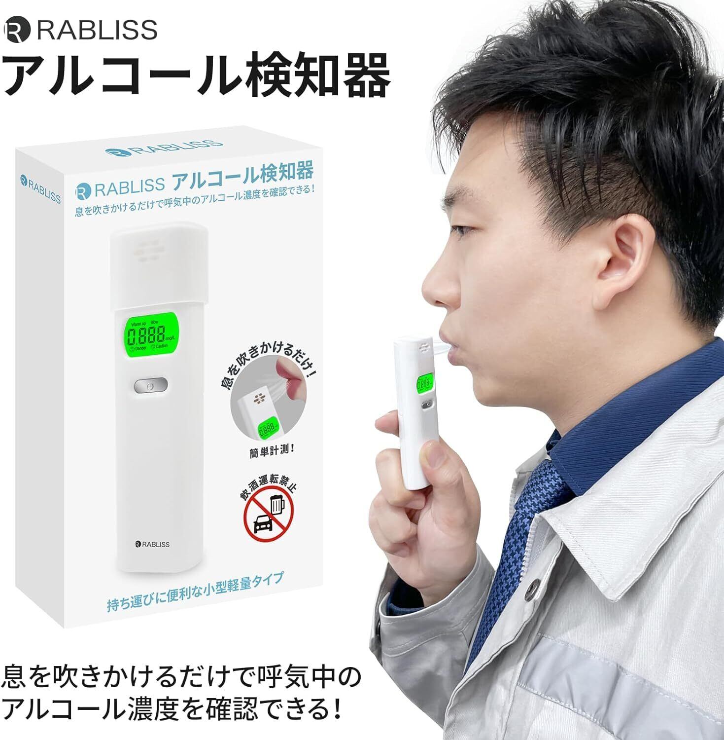 【スマートアラーム】警告音機能あり、測定結果によって、三つの状態が表示します。「未飲酒状態」LEDインジケータが緑点灯し、音声が出しません、運転できます。「飲酒状態」測定結果が「0.100~0.245mg/L」の時は、表示部に「Caution」と表示され警報音が鳴ります。、音が鳴らます、運転できません。「酔った状態」測定結果が「0.250mg/L以上」の時は、表示部に「Danger」と表示され、Caution ダウより大きい警報音が鳴ります。(警告音を止めるには、電源ボタンを長押ししてい。電源をオフにしてください。)