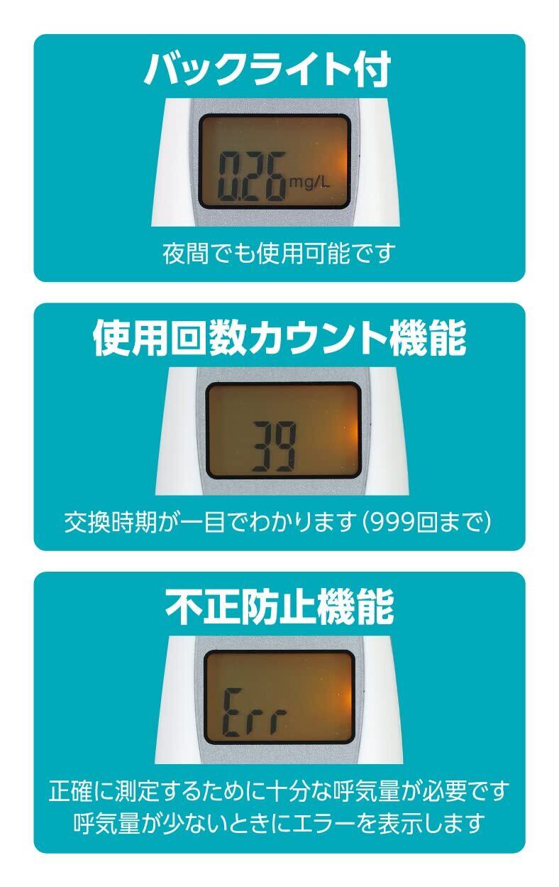 ●使用回数カウント機能付きです。●交換時期が一目でわかります。※使用回数目安は1000回です。●バックライト機能つきで夜間でも使用可能です。●不正防止機能付き。●呼気の量が少ないときのエラー表示機能。