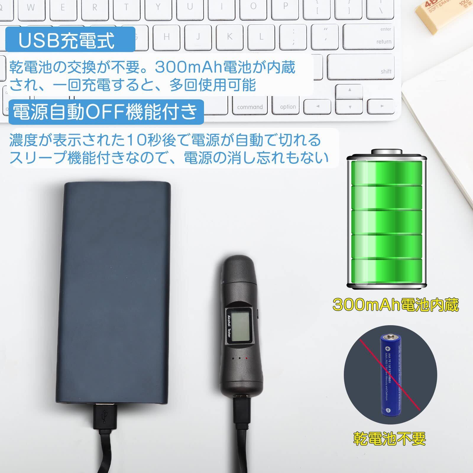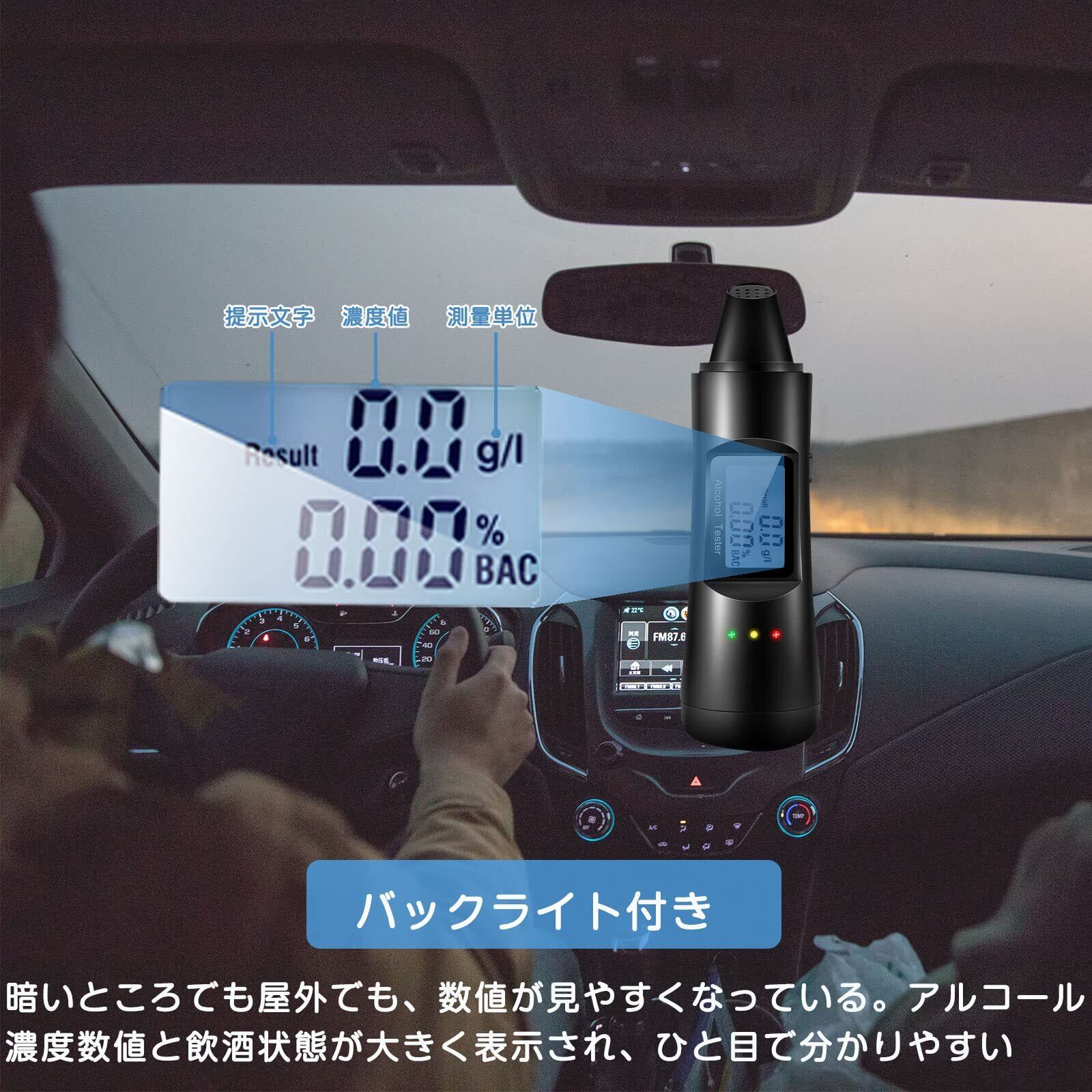 [USB充電式&自動off機能]アルコールチェッカーはUSB充電式なので、乾電池の交換が不要です。300mAh電池が内蔵され、一回充電すると、多回に使用可能です。濃度が表示された10秒後で電源が自動で切れる機能付きなので、電源の消し忘れもなく、省エネです。 [デジタル表示&バックライト付き]デジタルスクリーンにはアルコール濃度数値と飲酒状態が大きく表示され、視聴性は高く、ひと目で分かりやすいです。バックライト付き、暗いところでも屋外でも、数値が見やすくなっています。