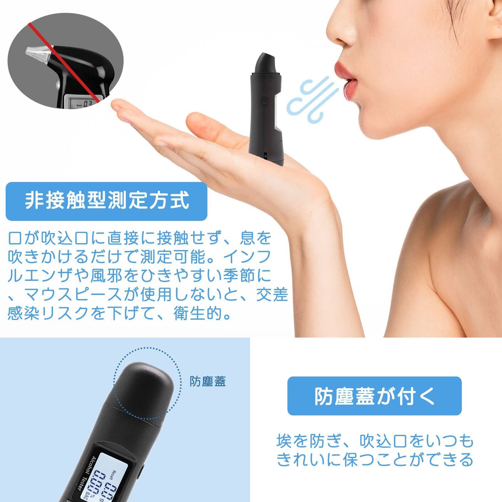 [非接触型衛生&マウスピース消耗]アルコール検知器は非接触型測定方式を採用しており、口が吹込口に直接に接触せず、息を吹きかけるだけで測定可能です。インフルエンザや風邪をひきやすい季節に、マウスピースが使用しないと、交差感染リスクを下げて、衛生的です。かつ、マウスピースを交換工夫が要らなく、すぐに測定できて便利です。マウスピース消耗のランニングコストも節約できて、財布にも優しいです。
