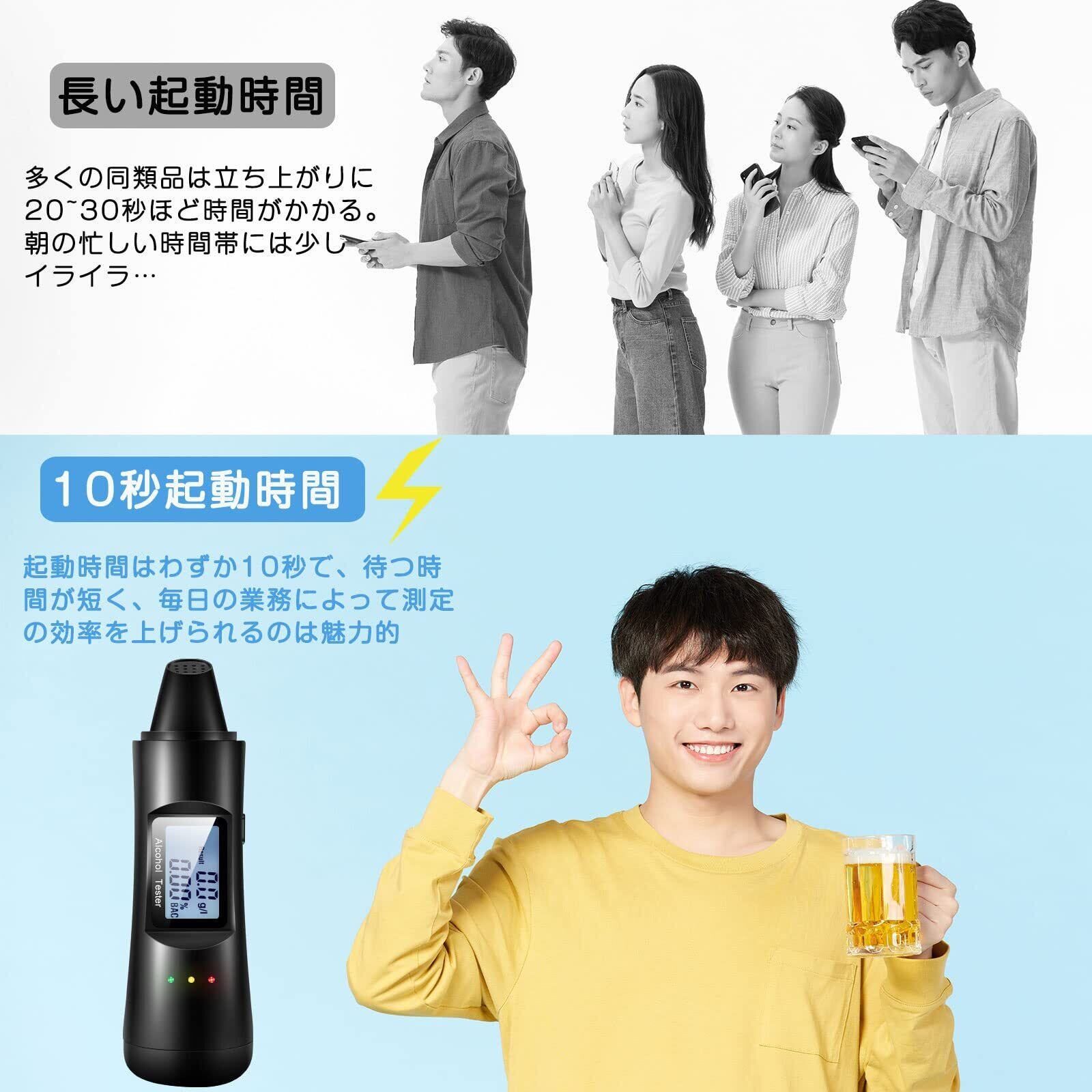 [高感度半導体センサー&短い待つ時間]アルコールチェッカーは高感度半導体センサーが搭載しており、電源ボタンを押してわずか10秒間カウントダウンで待ったら息を吹きかけると、アルコール濃度が直ちに検出できます。待つ時間が短く、毎日の業務によって測定の効率を上げられるのは魅力的です。酔った状態になると、アラーム音が出たり、指示インジケーターが表示されたりしています。濃度によって指示インジケーターの色が変わるので、判断能力が落ちているときでも、デジタル表記とアラーム音と色の表示で酔いの程度を確認しやすいです。