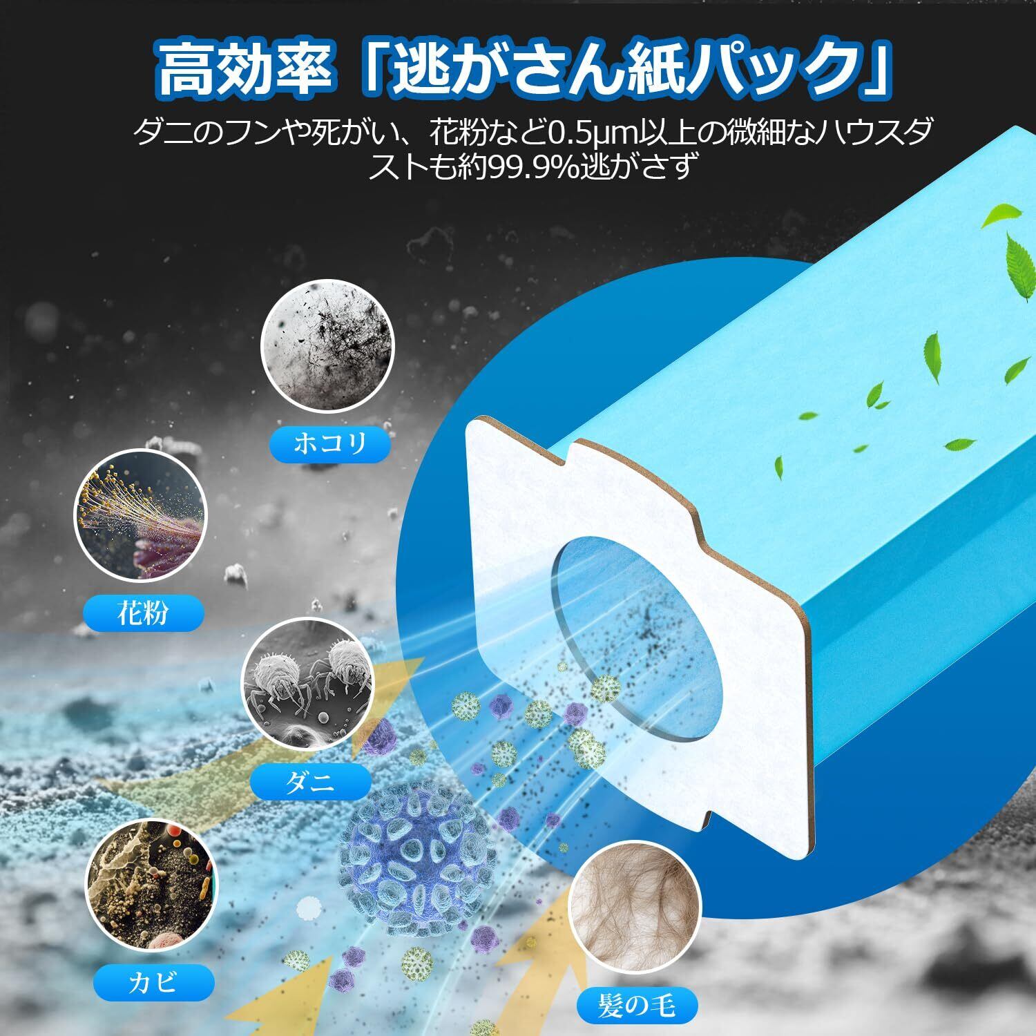 【抗菌紙パック】ゴミに潜む細菌、ウィルス、花粉、ダニなどの粒径0.1μm以下の超微小粒子状物質も99.99%をしっかり集めます。