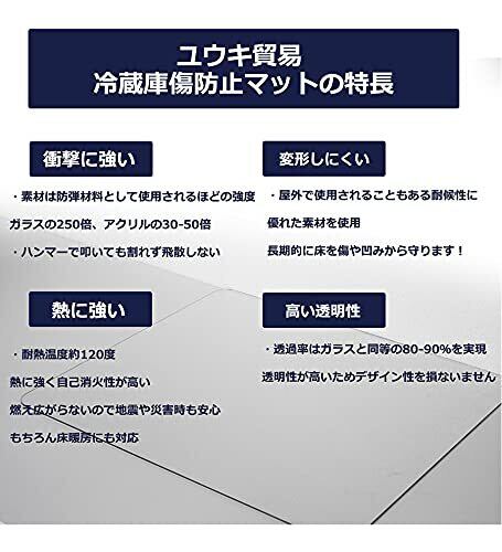 【床暖房対応】この冷蔵庫マットは、耐熱温度が120℃あり、床暖房にも対応しています。高温でも低温でも、このマットは非常に強い素材でできています。また、電気を通しにくく、火をつけても燃え広がりにくく、自己消火性にも優れているため、安心して使用できます。
