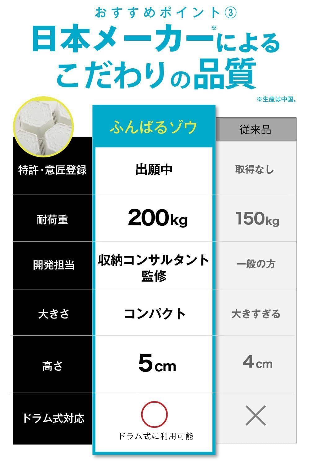 【一般家庭向けに考え抜かれた5cmの高さ】 ふんばるゾウの高さは、他社製品の4cmや6cmではなく、最も使いやすい5cmで設計されています。 床から適度に距離を取ることで、洗濯機や冷蔵庫の下に湿気やカビが発生しにくく、清潔な環境を保てます。 洗濯機パンがないご家庭にもピッタリで、掃除もしやすく毎日のお手入れもラクラク。 他社製品の4cmや6cmではなく、湿気やホコリがたまりにくい最適な高さを確保。 洗濯機パンがないご家庭にもぴったりで、清掃がしやすく、毎日の手入れもラクラク。 家電の底部が湿気から守られることで、家電の寿命が延び、長く清潔に保てます。