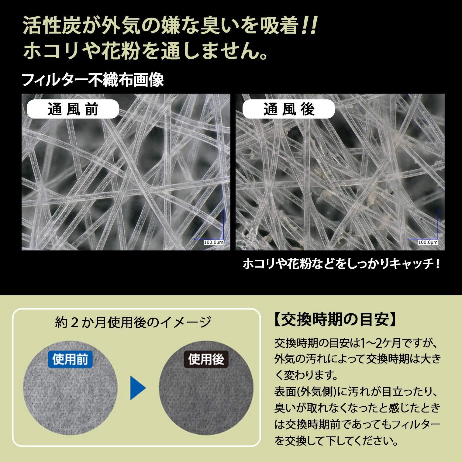 [交換時期の目安]約1~2カ月(外気の汚れによって交換時期は大きく変わります。表面(外気側)に汚れが目立ったり、臭いが取れなくなったと感じた時は交換時期前であってもフィルターを交換してください)