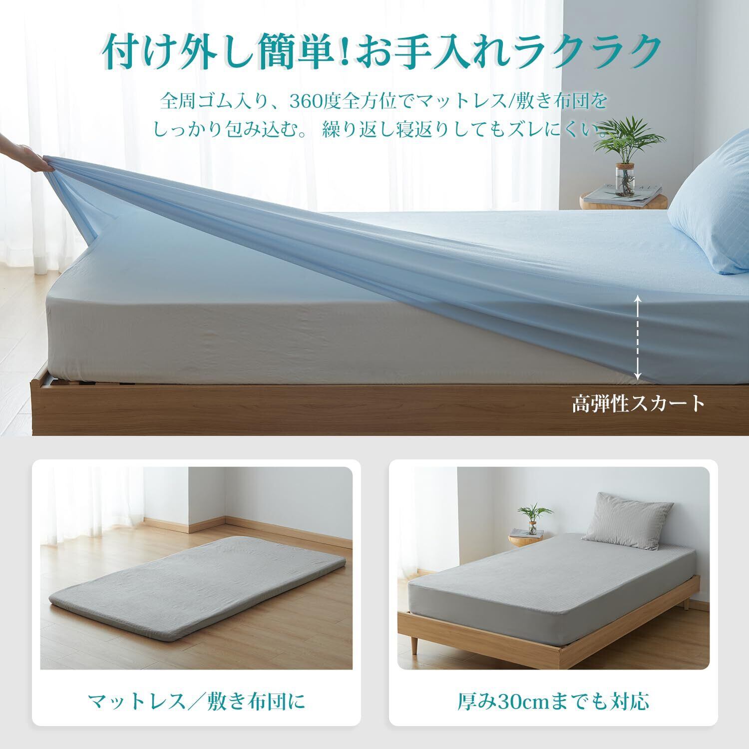仕様:マチ部分は約35cmとなります。ズレ防止ゴム付きボックスタイプなので、厚さ3-30cmのマットレスにぴったりフィットします! ベッド用/ マットレス用/ 敷き布団に、いろいろ使えます。着脱も簡単、寝相が悪くても大丈夫です。