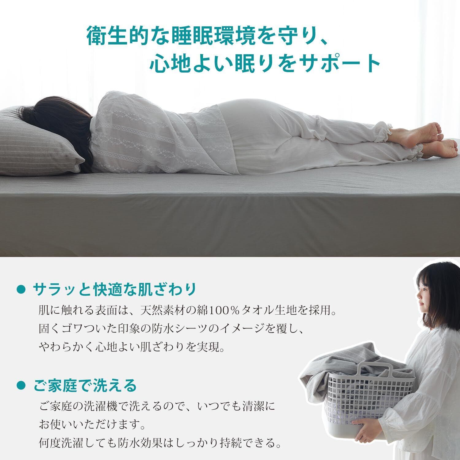 ・しっかり防水!水分をマットレスへもれずに安心!防水加工を施したシーツを使用することで布団やマットレスへの水分浸透を防ぎ、不快感を軽減し快適にお過ごしいただけます。
