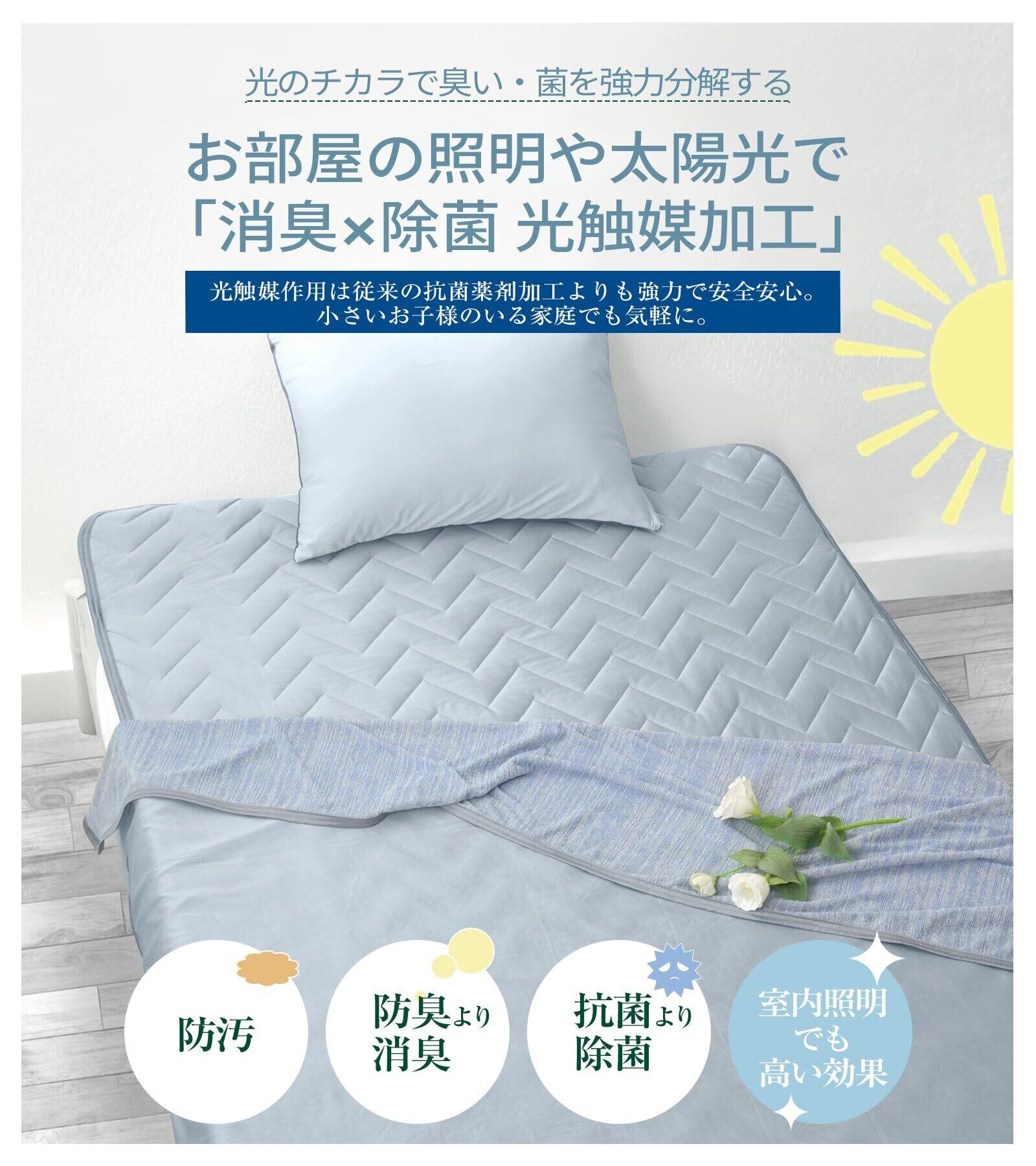 【制菌薬剤不使用!光のチカラで除菌&消臭】表地に光(太陽光や電灯の光)によって、菌やアレルゲン・臭い・ウイルスなど有害物質の吸着・分解・除去効果を発揮する光触媒加工を施しています。抗菌防臭よりも除菌消臭効果を期待できます!通常の抗菌加工では消臭剤などが頻繁に使用されておりますが、W極冷感まくらカバーは光触媒技術で、ひかりの力で効果を発揮しますので、お子様やペットがいるご家庭でも安心にお使いいただけます。またの光触媒の特徴は、粉状二酸化チタンを使用せず、薄膜の光触媒を生成するところにあります。市販の粉状二酸化チタンなら繊維に練り込んだりしても空気や水の勢いに流されてしまいます。膜状に生成する技術を採用することで、1000回使っても効果が続きます。