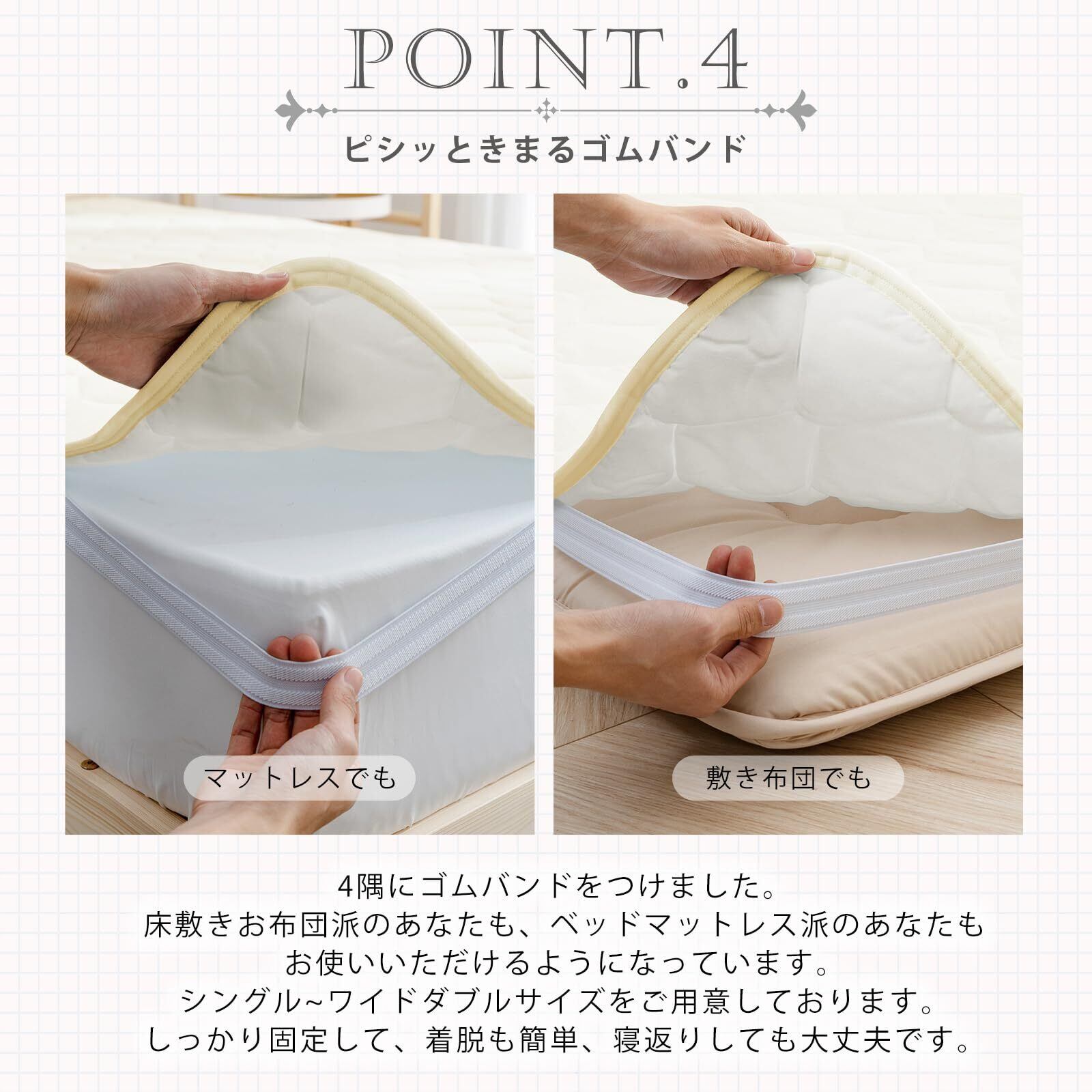 【ピシッと固定できるゴムバンド】4隅にゴムバンドをつけた敷パッドです。布団派の方も、ベッドマットレス派の方もお使いいただけます。シングルからファミリーサイズまでのサイズをご用意していますが、ロングサイズにも対応可能です。しっかりと固定できるので、シーツの脱着が簡単に行えます。寝返りを打っても大丈夫です。