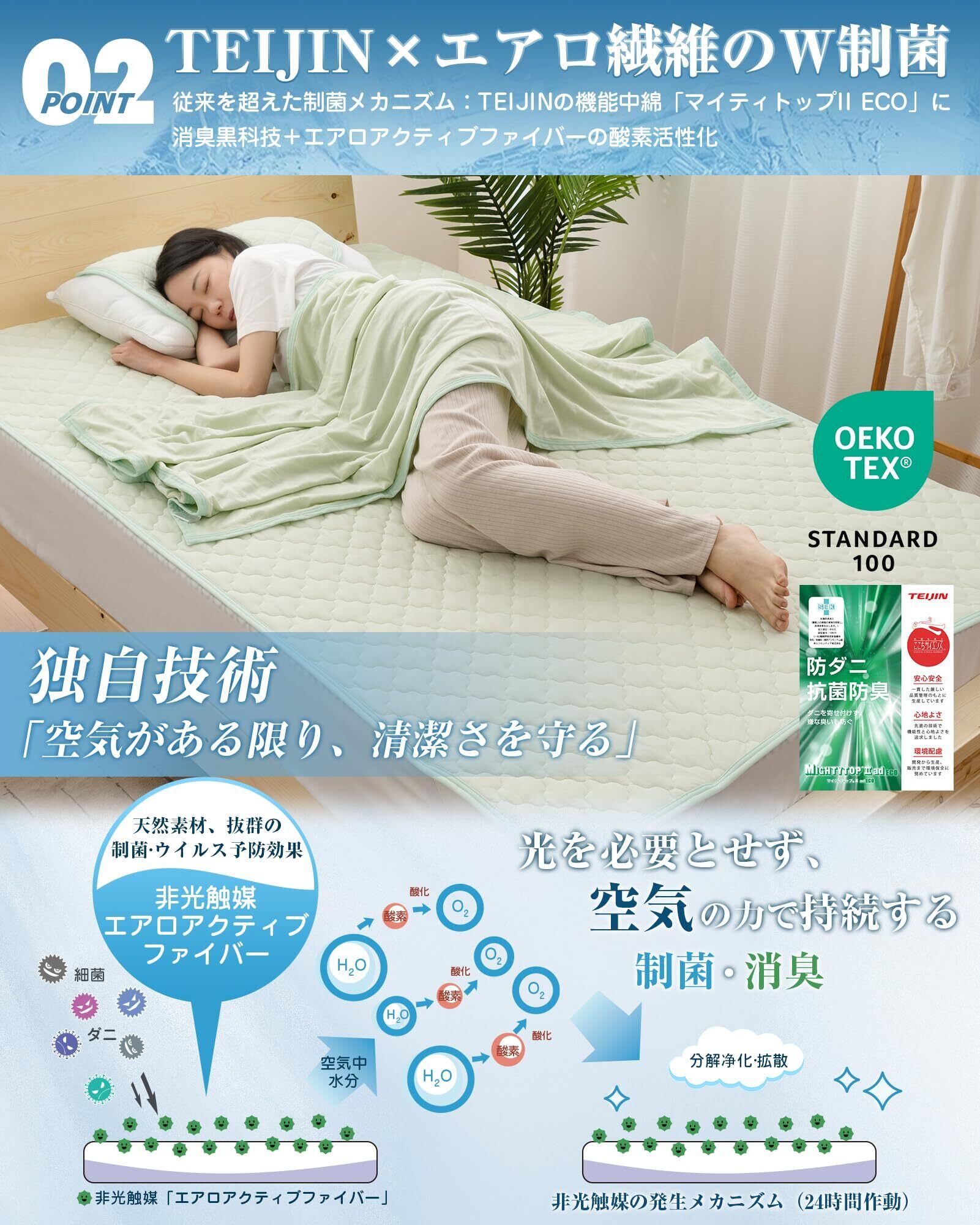 【TEIJIN×エアロ繊維のW制菌】 湿気や汗でジメジメする夏は、菌が繁殖しやすい季節です。中わたにテイジンの機能繊維「マイティトップII ECO」と、エアロアクティブファイバーの酸素活性化の組み合わせで、空気がある限り、24時間持続的に制菌消臭作用を発揮する。低ホルムアルデヒドなのでお子様にも安心。洗濯しても抗菌防臭・防ダニ効果は持続します。