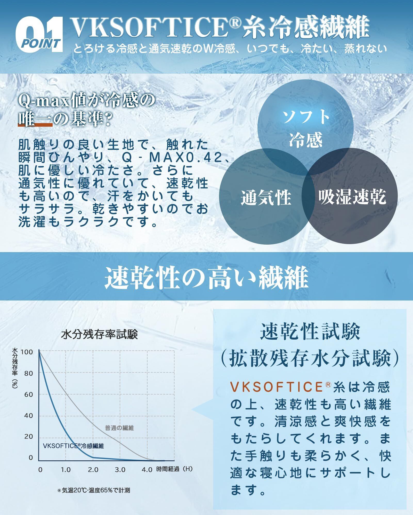 【VKSOFTICE 糸冷感繊維】寝床内気候が温度33±1℃、相対湿度50±5%の範囲であれば、快適な睡眠が得られている。VKSOFTICE 糸はふかふかなのにひんやり、身体に優しい快適温度で、夏の睡眠を変える次世代冷感繊維。Q-MAX0.42で、触った瞬間ひんやりとした心地よさがあります。優れた吸湿·放湿性により、寝ている間に汗を吸収·放出、いつでもサラサラ。快適な寝床内気候を維持します。