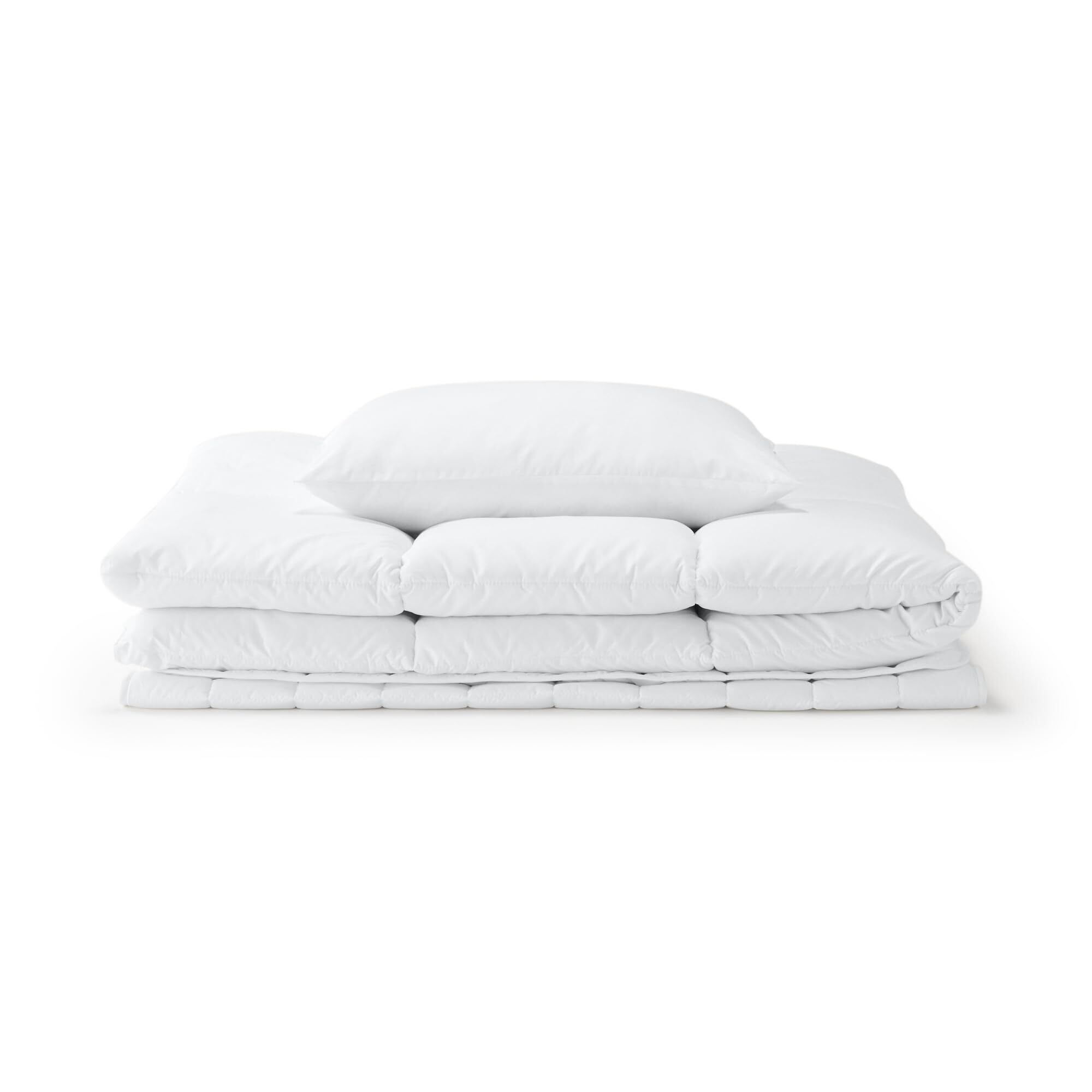 掛ふとん、ベッドパッド、枕をセットにしました。側生地を高密度に織り、防ダニ仕様にしました。