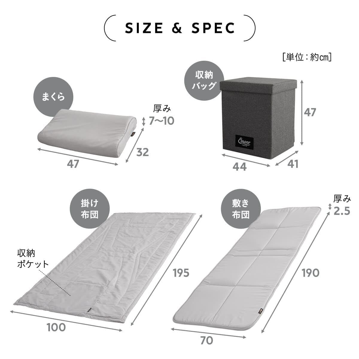 【掛け布団】■サイズ 約幅100×奥行195cm ■組成 側生地:ポリエステル100%(吸湿速乾糸40%使用)/中わた:ポリエステル100%(マイクロ綿) 約500g ■機能 静電気防止機能付き・収納ポケット付き ■重量 約900g ■お手入れ方法 洗濯機で丸洗い可能 ※洗濯ネット使用推奨 【敷布団】■サイズ 約幅70×奥行190×厚さ2.5cm ■組成 側生地:ポリエステル100%(吸湿速乾糸40%使用)/中材:高反発ポリウレタンフォーム 25D ■機能 静電気防止機能付き・ゴムバンド付き ■重量 約1.6kg ■意匠取得済み(意匠登録 第1583589号)