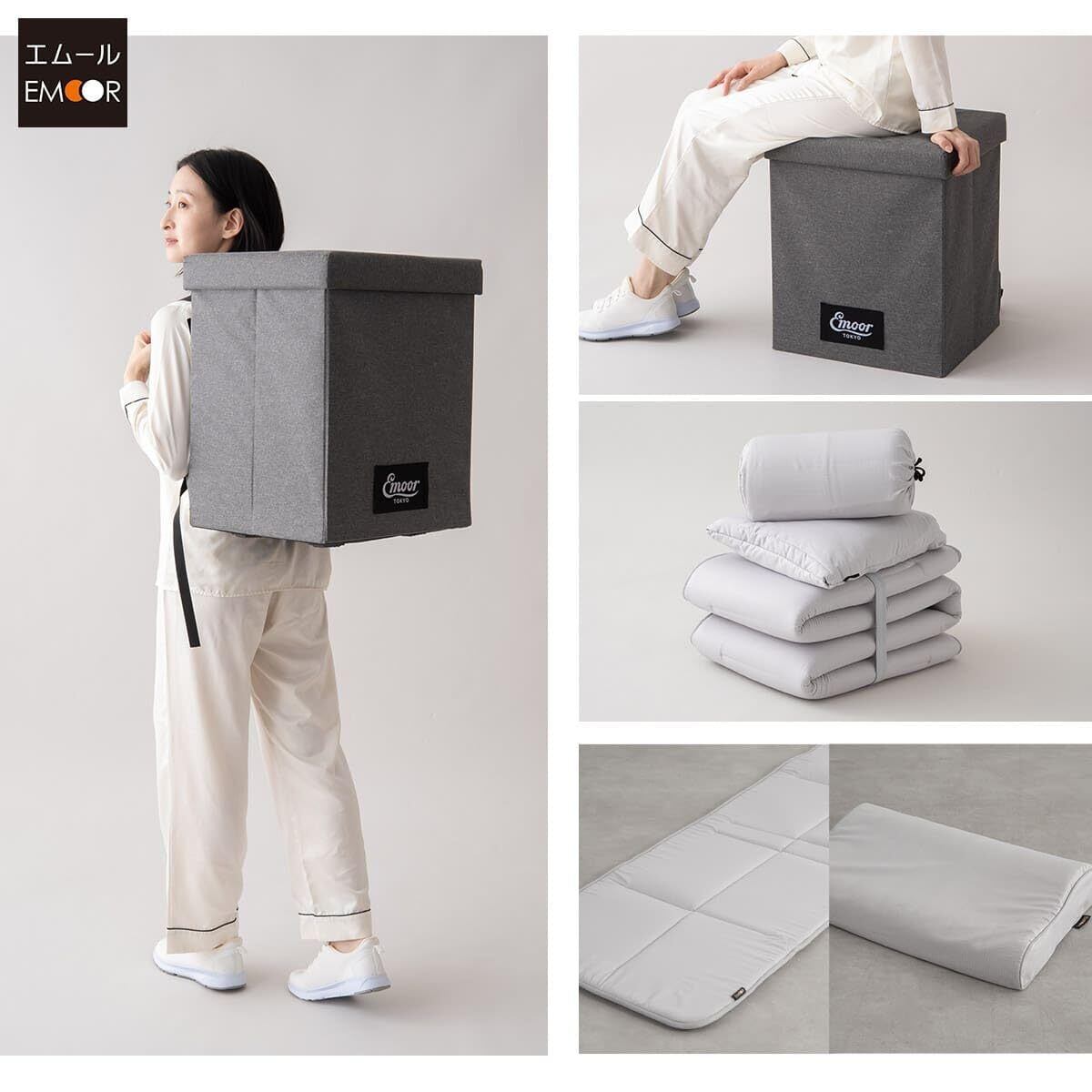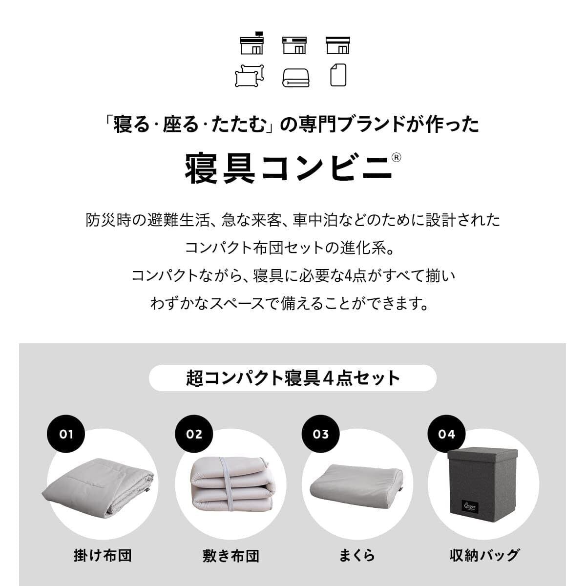 『寝る・座る・たたむ』の専門ブランドが作った、“備える人”のための布団セット「寝具コンビニ(R)」。防災時の避難生活、急な来客、車中泊やミニマルライフに対応するために設計された、コンパクト布団セットの進化系!コンパクトながら寝具に必要な4点がすべて揃い、わずかなスペースで備えることができます。