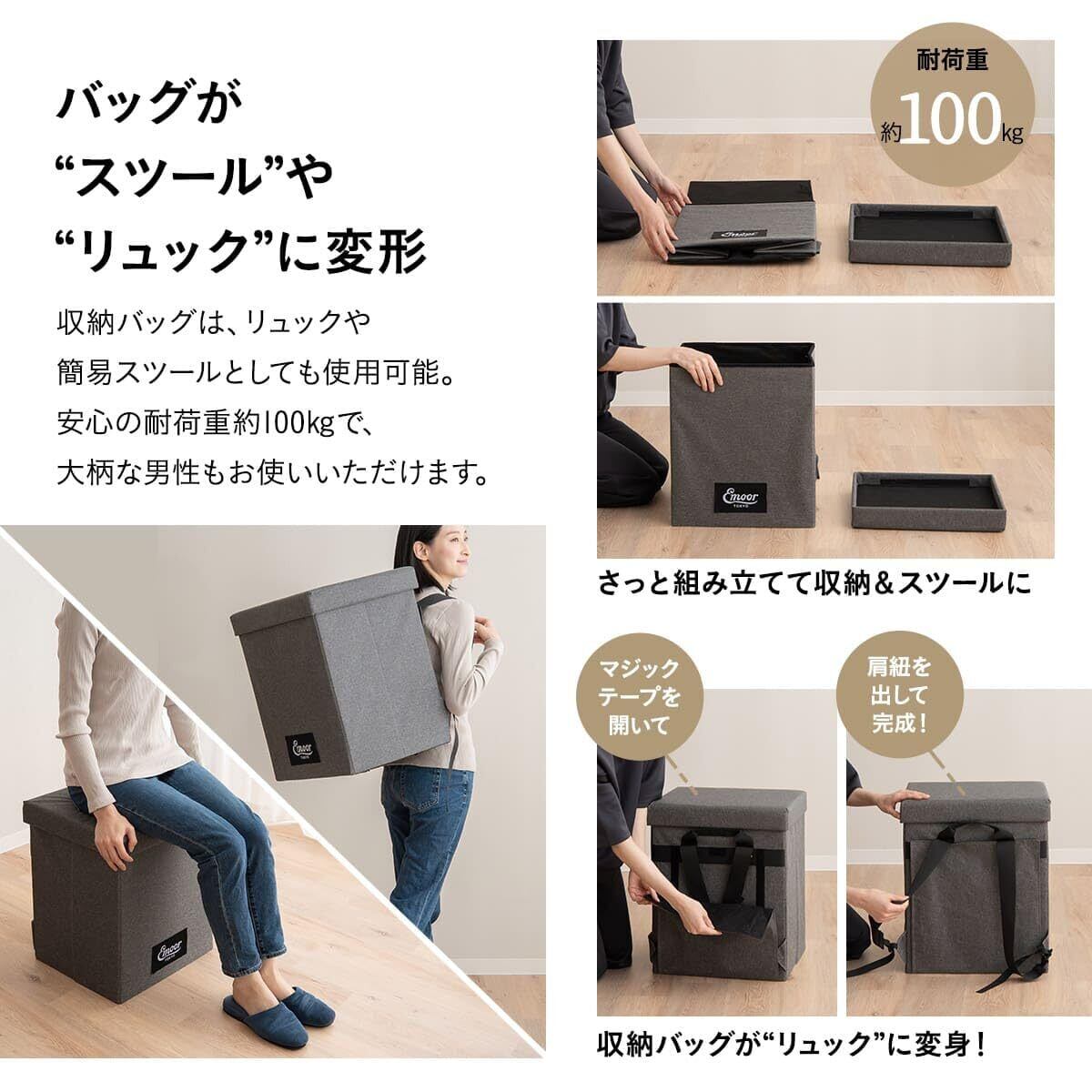 収納バッグは、簡易スツールとしても使用可能。安心の耐荷重約100kgで、大柄な男性もお使いいただけます。リュック型に変形できて持ち運びしやすく、座る場所が確保しづらい避難所などでも活用できます。