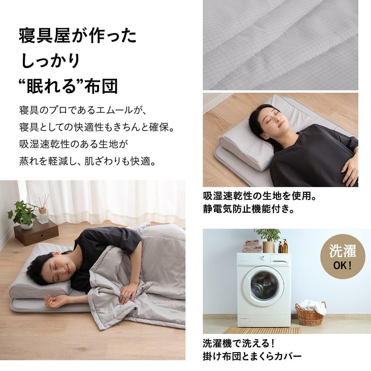 掛け布団・敷布団・枕がコンパクトに畳めます。独自の収納構造により、一般的な布団より省スペース性を実現。吸湿速乾性のある生地を使用し、蒸れを軽減して肌ざわりも快適です。掛け布団と枕カバーは、洗濯機洗い可能(洗濯ネット使用推奨)。敷布団は、定期的に日陰干しを推奨します。