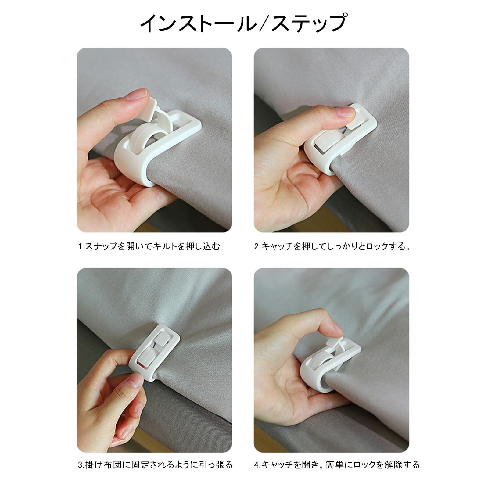 【簡単な操作 シンプルで使いやすい】ボタンのスイッチを入れ、固定クリップを掛け布団に当て、前面を押し下げるだけで掛け布団が固定されます。ピンで固定する必要がないので、羽毛布団を傷つけることなく安心してお使いいただけます。