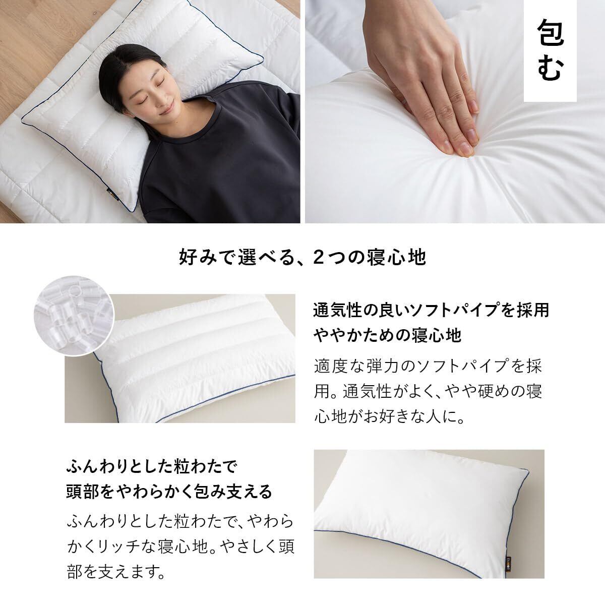 <2つの寝心地を好みで選べる枕>片面は適度な弾力のソフトパイプを採用。通気性が良く、やや硬めの寝心地です。もう片面には、やわらかくリッチな寝心地の粒わたを使用。リバーシブルなので、お好みや気分に合わせた寝心地をお選びいただけます。洗濯機で丸洗いが可能です。