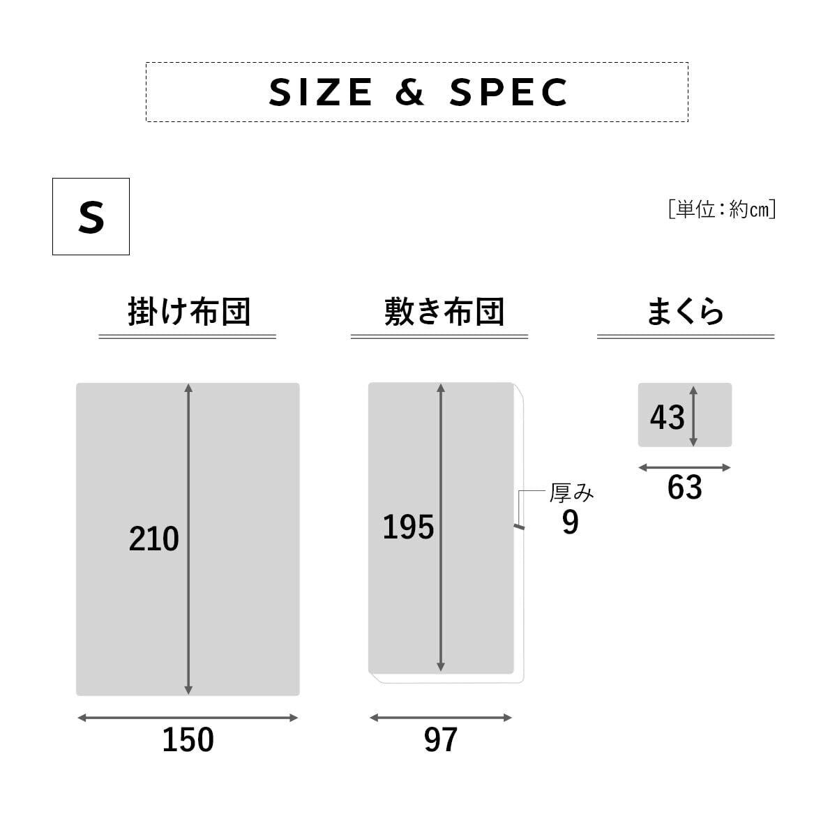 【掛け布団】■サイズ 約150×210cm ■組成 側生地:ポリエステル100%(パイピング付き)/中材:ポリエステル100%(東レft(R)) ■商品重量 約2.1kg ■仕様 6ヶ所ループ付き ■お手入れ方法 洗濯機丸洗い可能 ※洗濯ネット使用推奨・タンブラー乾燥不可 ■製造国 中国 【枕】■サイズ 約63×43cm ■組成 側生地:ポリエステル100%(パイピング付き)/中材(ややかため):ポリエチレンパイプ/中材(やわらかめ):ポリエステル100% ■商品重量 約850g ■お手入れ方法 弱水流モードで洗濯機洗い可能 ※洗濯ネット使用推奨・形を整えてから釣り影干し推奨 ■製造国 中国