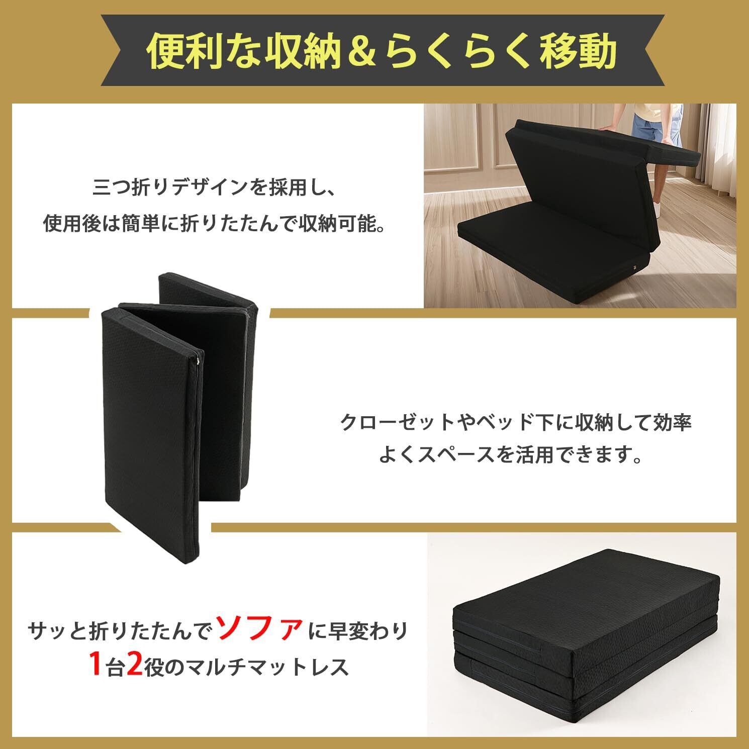 このマットレスは、実用性と快適性を追求した設計で、機能性とコンパクトさを求める方におすすめです。三つ折り構造により、使わない時にコンパクトに収納でき、持ち運びも簡単になります。高密度ウレタンフォームの材質も睡眠の質を向上させ、ストレスを軽減させる効果があります。
