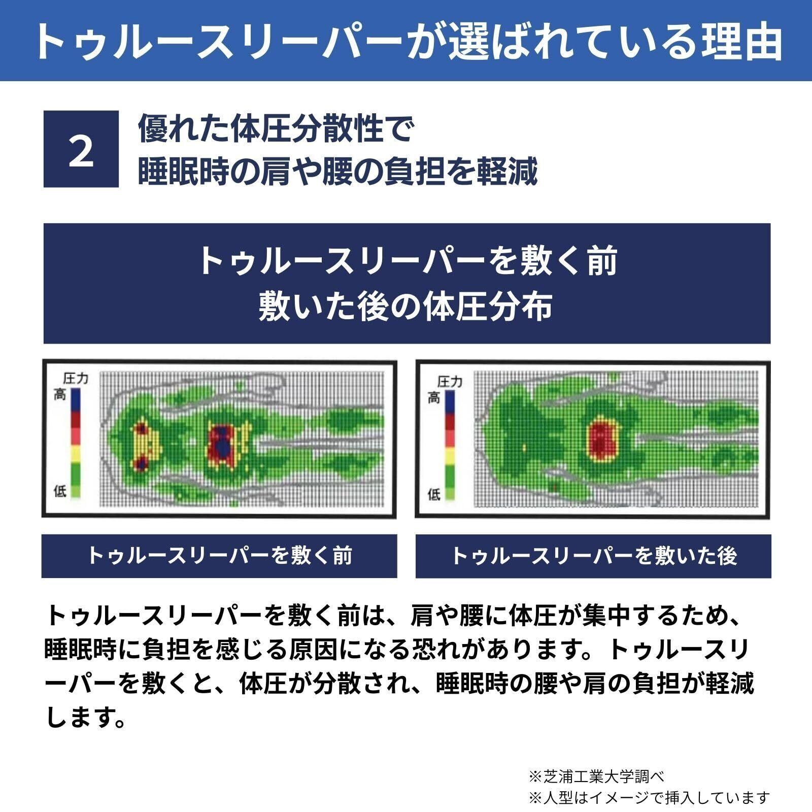 【優れた体圧分散で肩や腰の負担を軽減】トゥルースリーパーを敷く前は、肩や腰に体圧が集中する為、睡眠時に負担を感じる原因になる恐れがあります。トゥルースリーパーを敷くと、体圧が分散され、睡眠時の腰や肩の負担が軽減します。