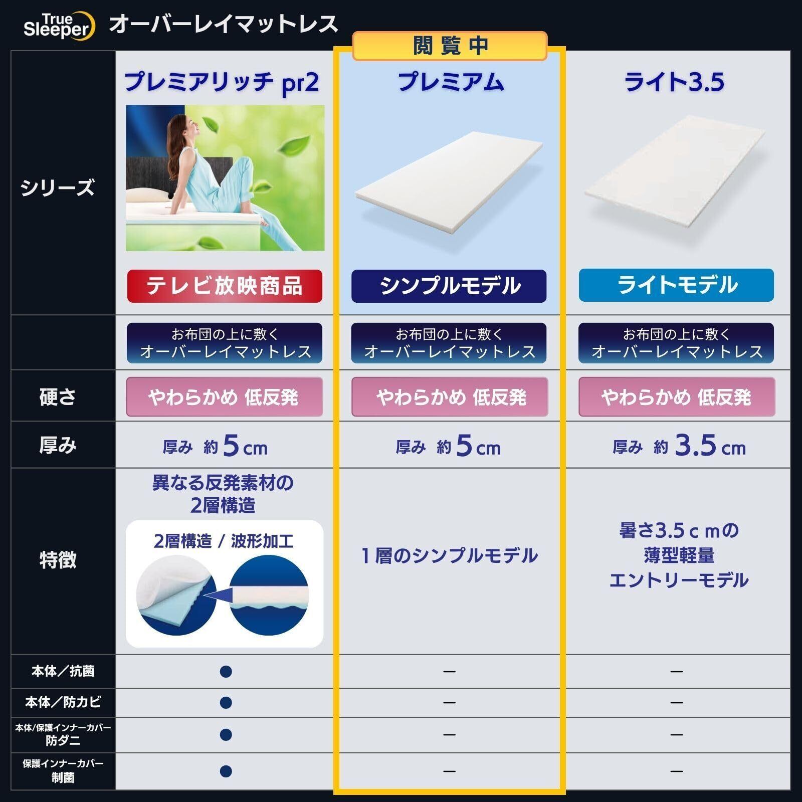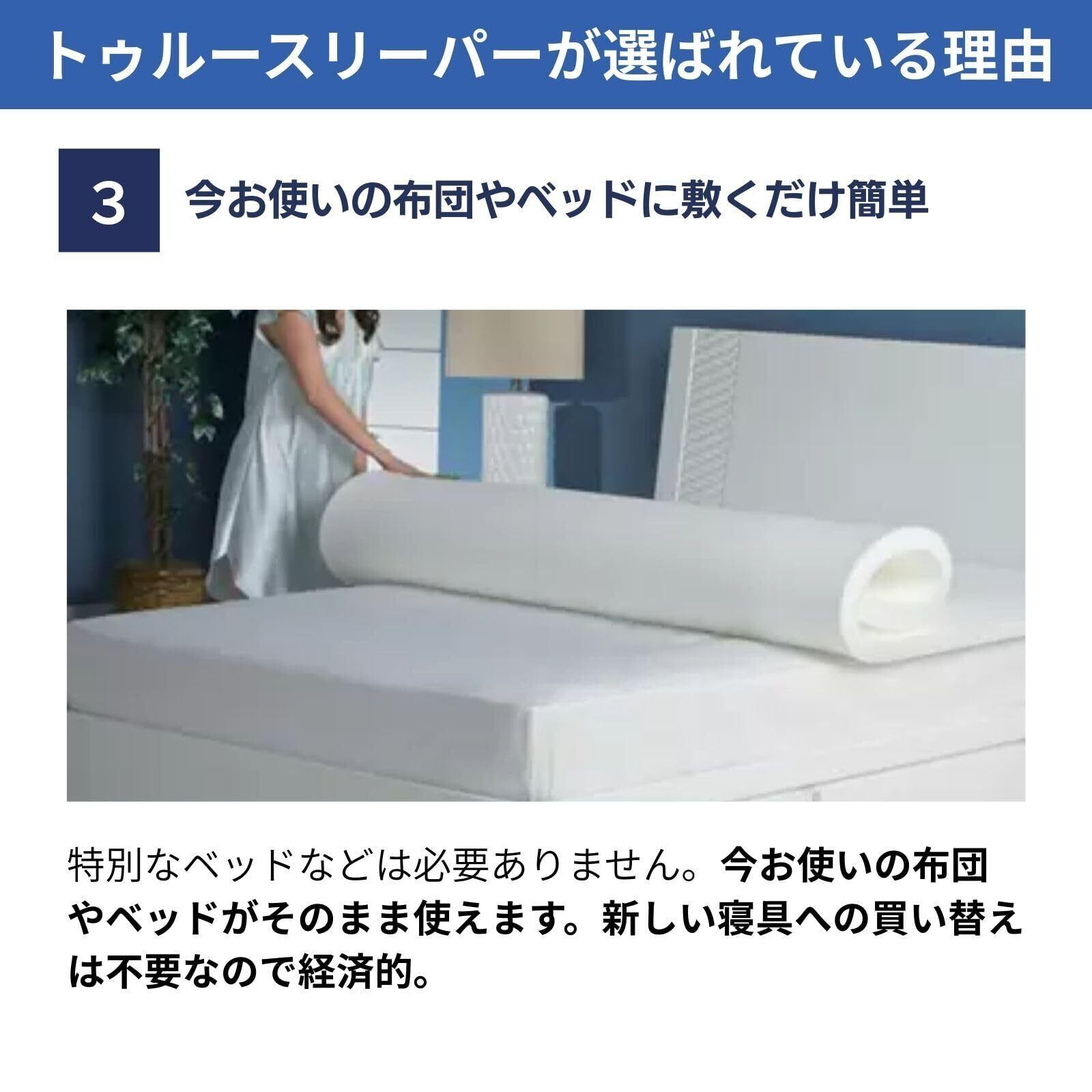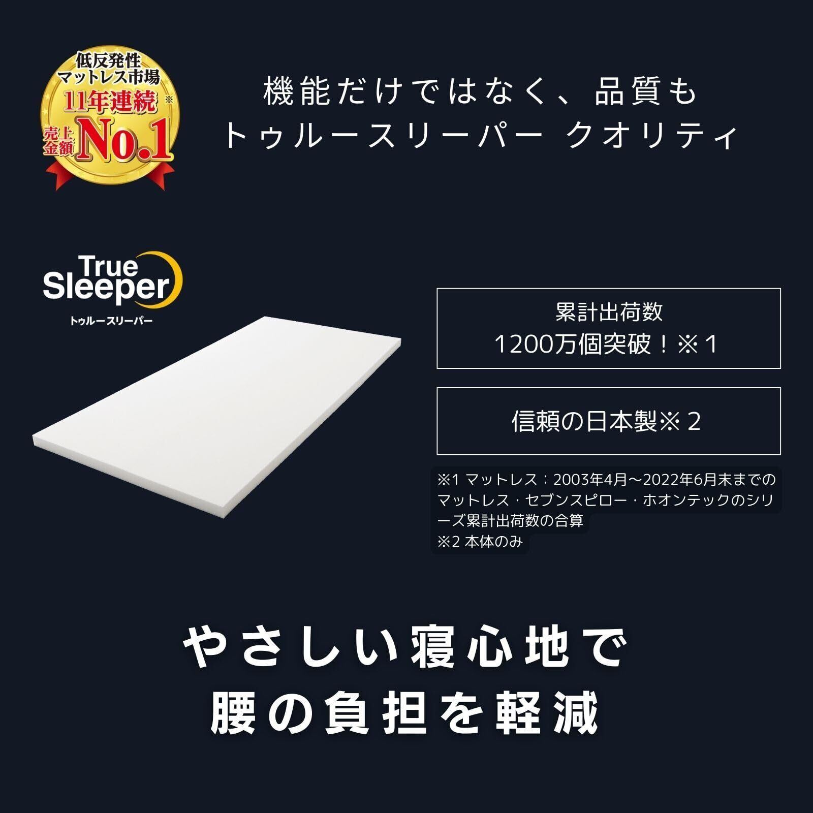 弾力性・復元力に優れた低反発マットレス「トゥルースリーパープレミアム」。あなたの眠りの悩みを解決する、ロングセラーの低反発マットレスです。オーバーレイマットレスなので、今お使いのお布団やマットレスの上に敷くだけです。
