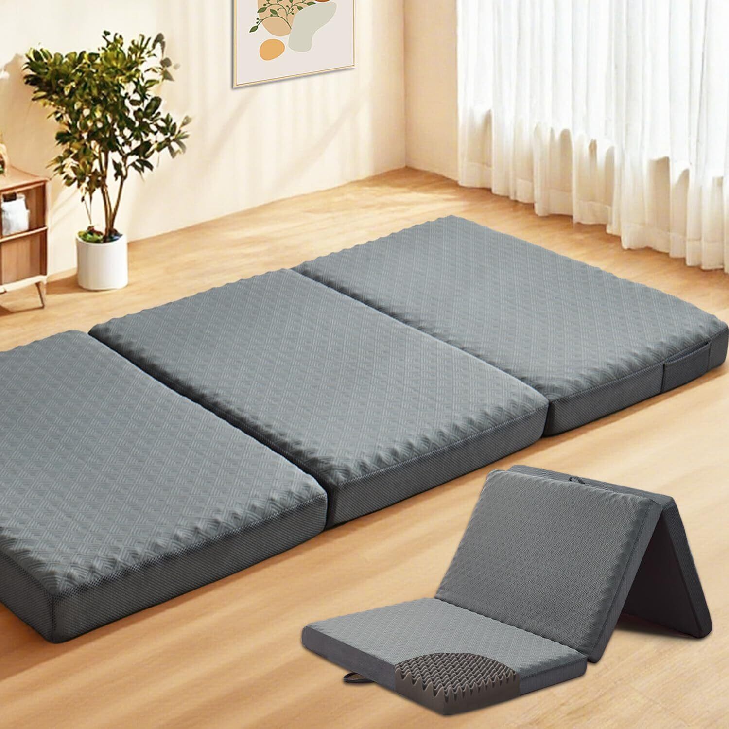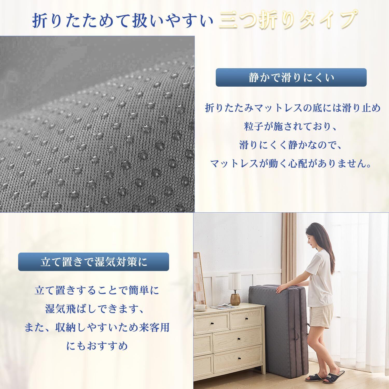 【滑り止めデザイン・収納簡単・多用途】三つ折りマットレスの底部には滑り止めデザインので、マットレスとゆかの間の摩擦が増加し、使用中にマットレスが動くのを防ぎます。使わない時にコンパクトに収納でき、軽量なので誰でも簡単に持ち運べます。敷布団として床やベッドに使えるほか、ロフトやソファー、来客用にも様々なシーンで大活躍です。ご注意:コンパクトな梱包のため、開封時に折りシワや変形がある場合がありますが、一週間ほどで元に戻ります。ウレタンのにおいが気になる場合は、風通しの良い場所で陰干ししてください