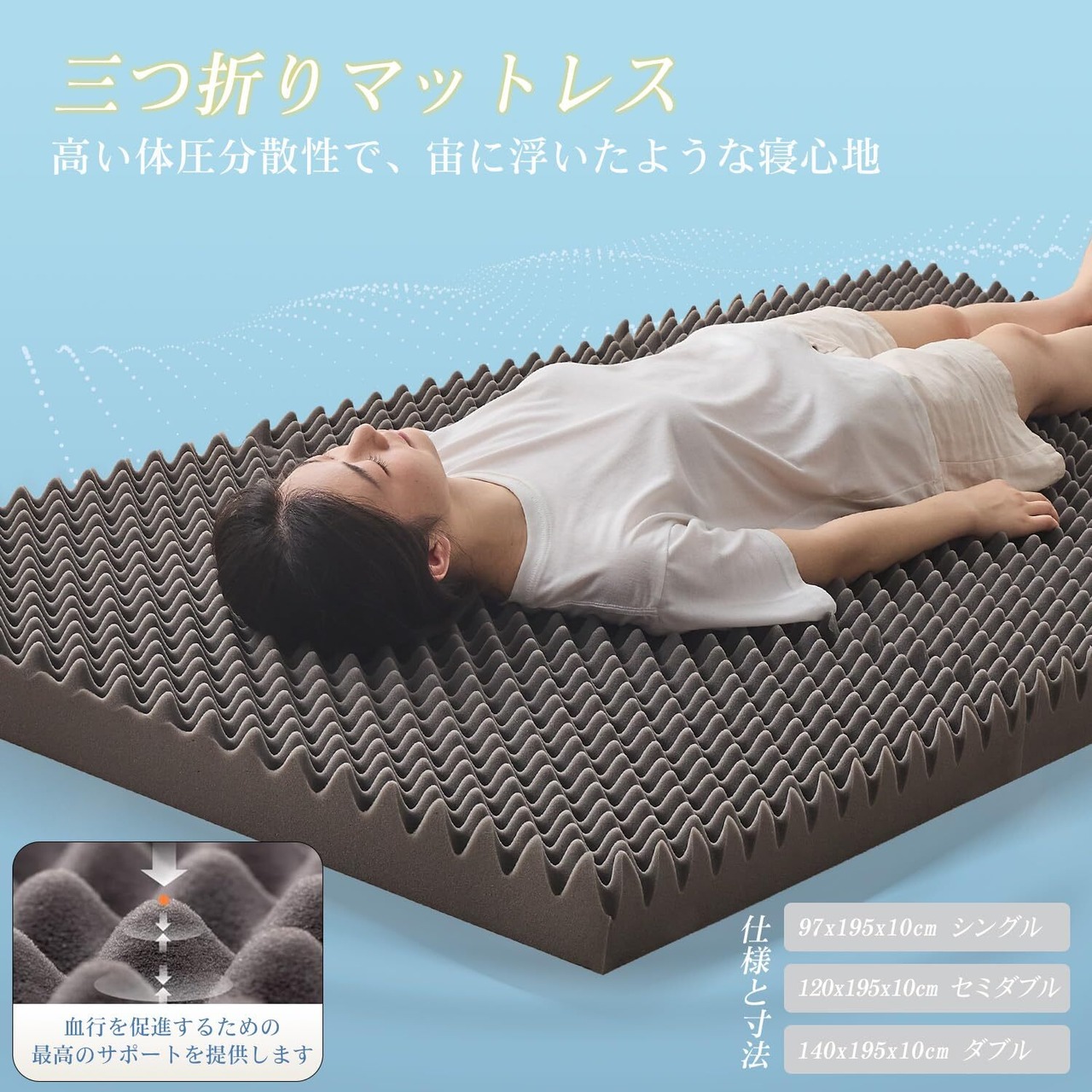 【数量限定】aicomri マットレス シングル 3つ折り 高反発 厚さ10 cm 折りたたみマットレス 洗えるカバー 硬め190N 凹凸加工 防臭防ダニ 底面滑り止め付き 体圧分散 5年 97x195 cm ダークグレー