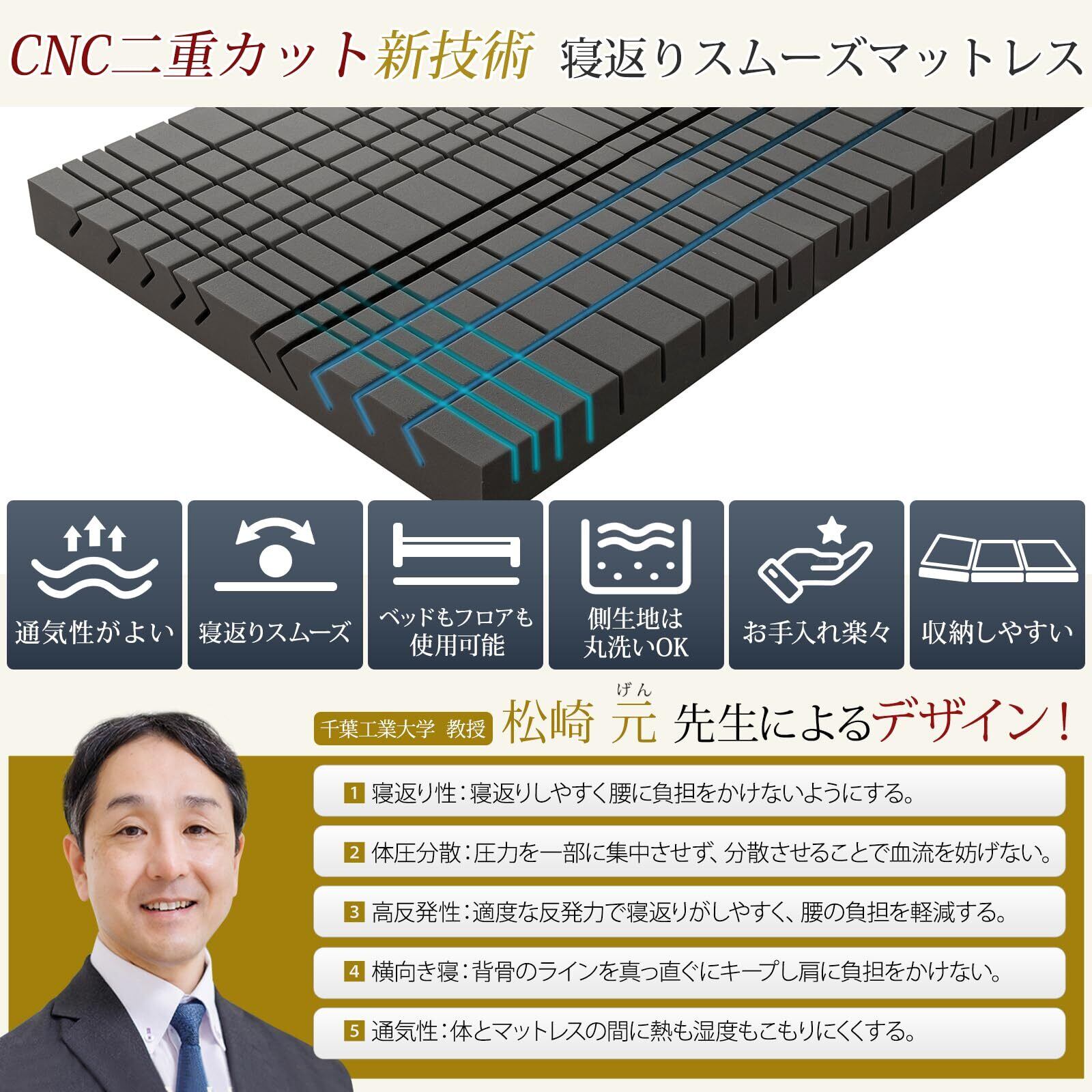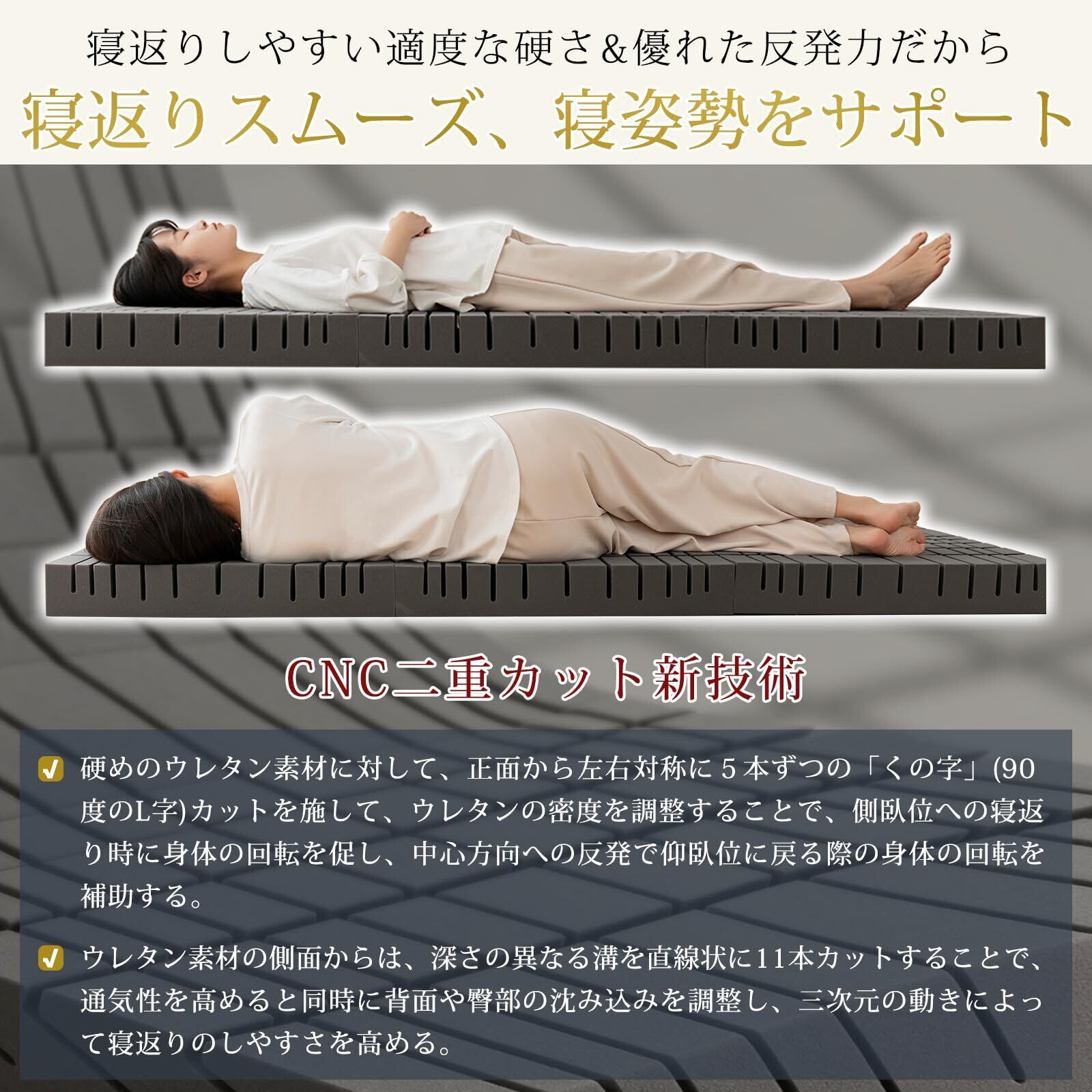 【CNC二重カット新技術】 硬めのウレタン素材に対して、正面から左右対称に5本ずつの「くの字」(90度のL字)カットを施して、ウレタンの密度を調整することで、側臥位への寝返り時に身体の回転を促し、中心方向への反発で仰臥位に戻る際の身体の回転を補助する。ウレタン素材の側面からは、深さの異なる溝を直線状に11本カットすることで、通気性を高めると同時に背面や臀部の沈み込みを調整し、三次元の動きによって寝返りのしやすさを高める。