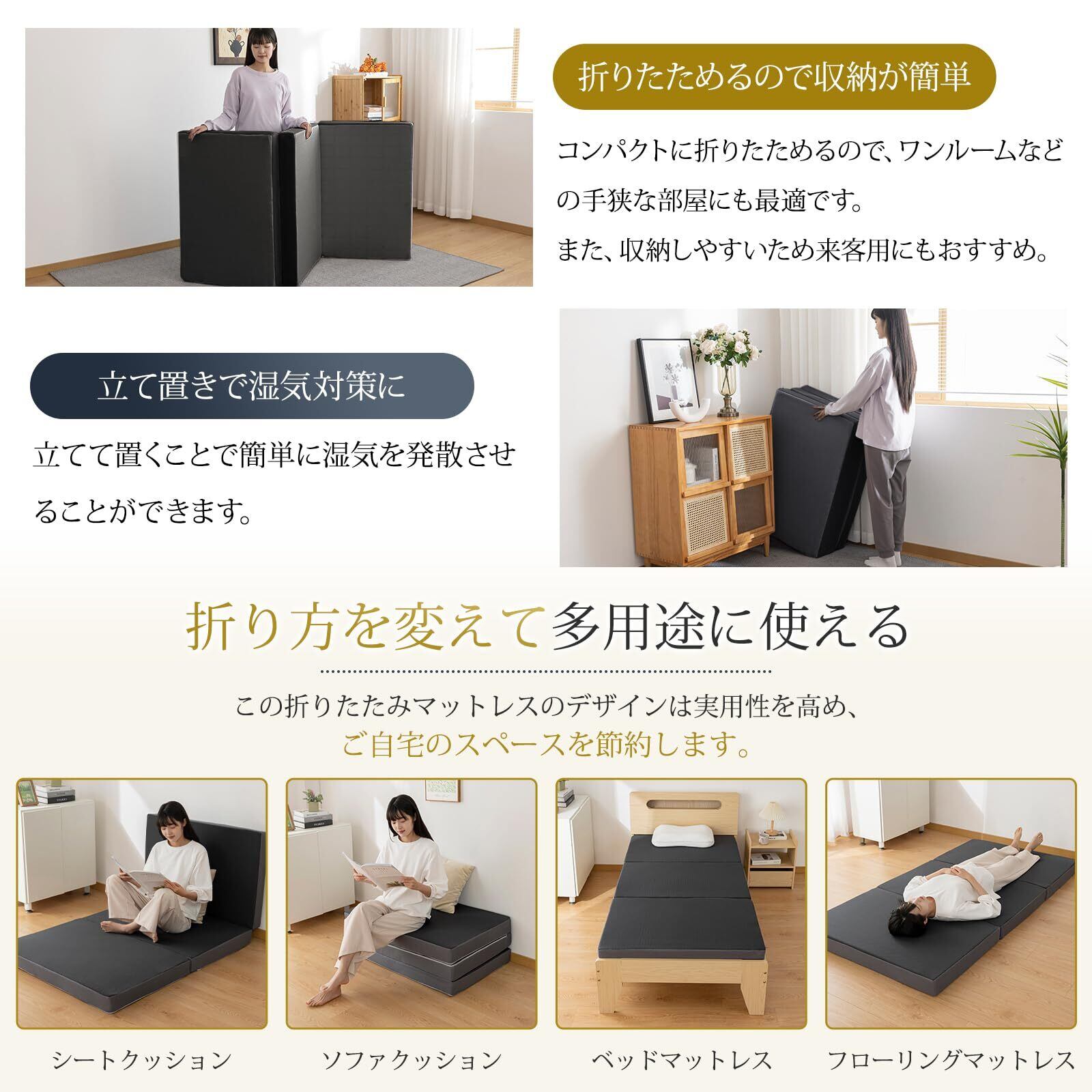 【コンパクトで収納便利】マットレスコンパクトに折りたためるので、ワンルームなどの手狭な部屋にも最適です。また、収納しやすいため来客用にもおすすめ。女性でも持ち運びもラクラクになります。コンパクトで様々な場所で使用できます。女性も楽に持ち運べます。また立て置きすることで簡単に湿気飛ばしできます。