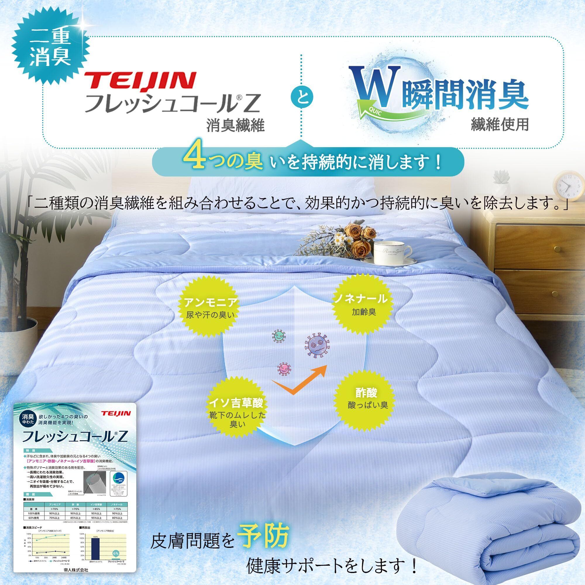 【TEIJIN・フレッシュコールZ・消臭】掛け布団は、帝人フレッシュコールZの中わたを使用しております。この「フレッシュコールZ」は、ポリエステル短繊維の中わた用機能素材で、アンモニアや酢酸、イソ吉草酸、ノネナールなど、汗や体臭、加齢臭の原因となる4つの主要な悪臭に対して優れた消臭効果を発揮します。さらに、機能剤を原綿に練り込んで製造しているため、洗濯を重ねてもその効果が長持ちし、機能耐久性にも優れています。