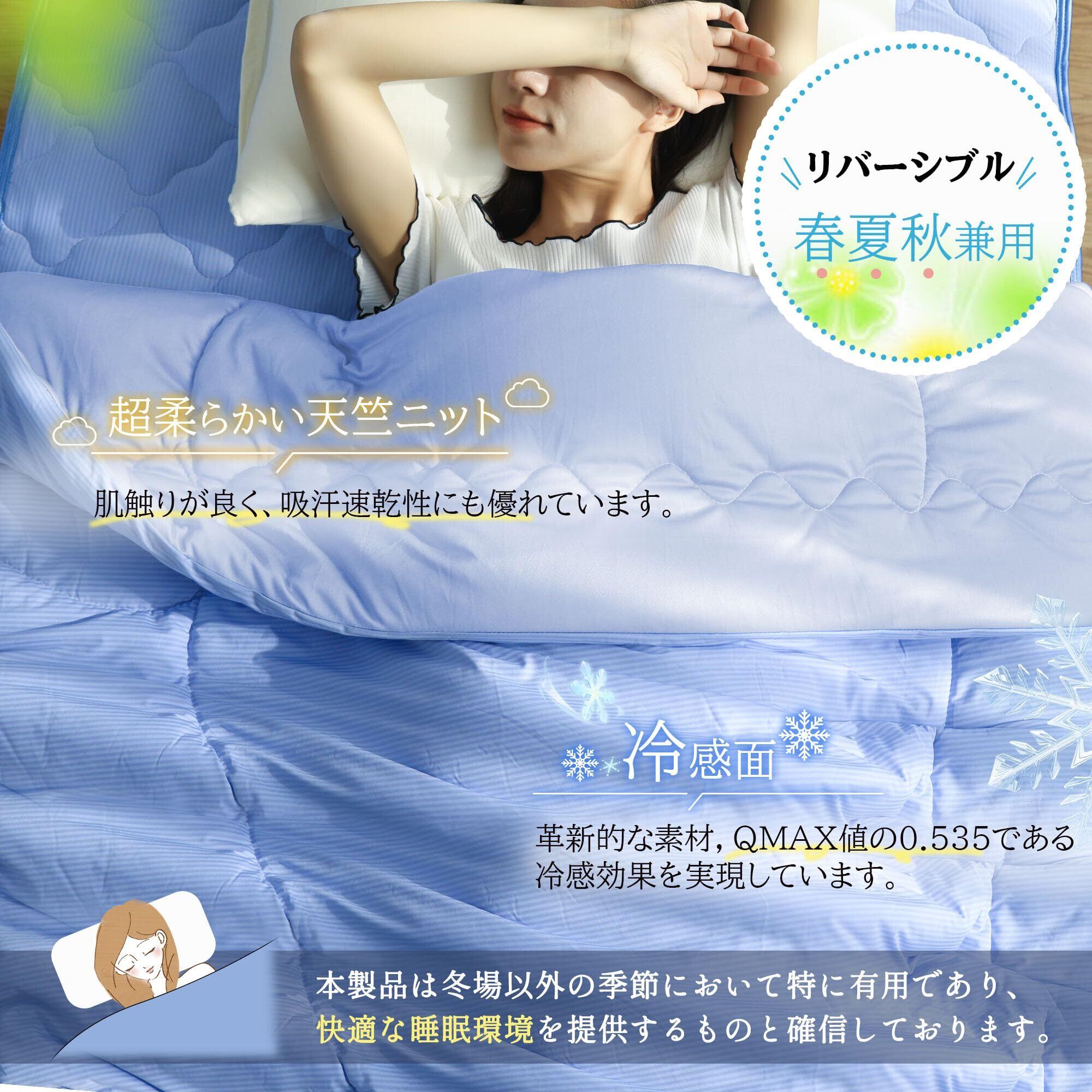 【リバーシブル・春夏秋兼用】この冷感掛け布団は、長期間にわたって利用可能なデザインとなっております。一方は冷感面で、革新的な素材を用いており、ナイロン繊維とマイカ鉱石粉末を混合することで優れたQMAX値の0.535である冷感効果を実現しています。もう一方は超柔らかい天竺ニット生地を使用しており、肌触りが良く、吸汗速乾性にも優れています。本製品は冬場以外の季節において特に有用であり、快適な睡眠環境を提供するものと確信しております。