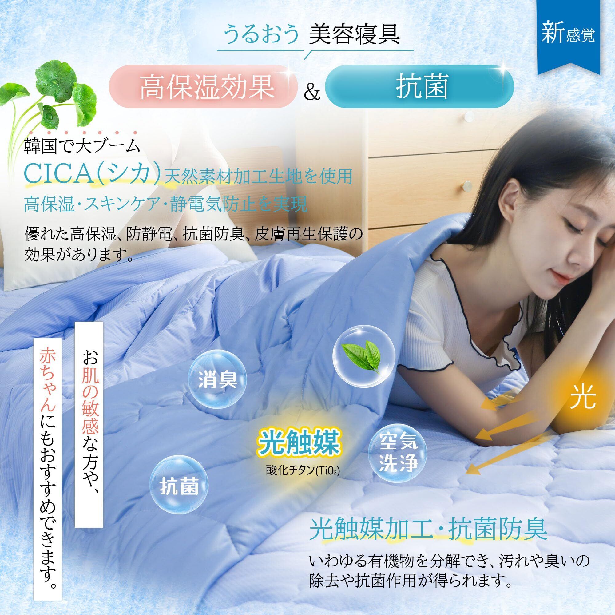 【CICA天然高保湿効果】掛け布団表面生地がパラファインCICA加工を施した。そのため、優れた高保湿、防静電、抗菌防臭、皮膚再生保護の効果があります。やわらかな風合いとなめらかな肌ざわりが最高です!また、パラファインCICAには、優れた抗酸化作用、傷跡ケア、皮膚再生保護作用で知られるツボ草エキスが配合されています。敏感小さなお子様のいるご家庭でも安心です。