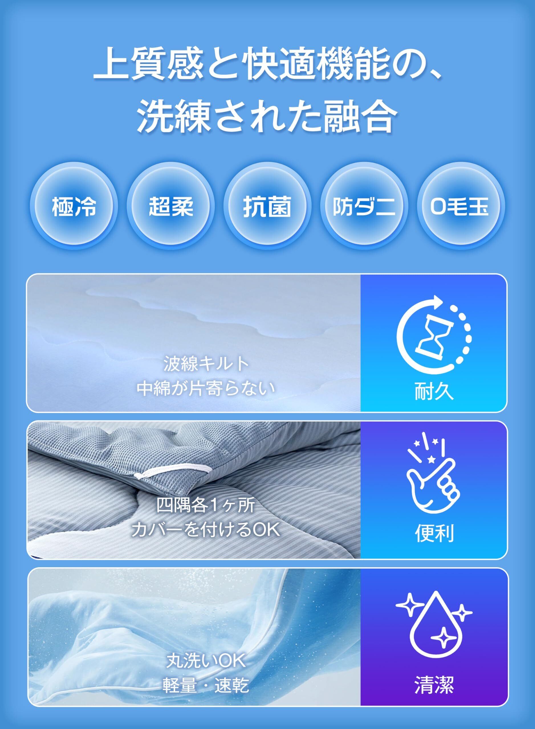 【極涼冷感掛け布団】本品は業界最高レベル冷感素材のQ-MAX0.5のナイロン生地を採用。ナイロン繊維の熱伝導率高く、肌に触れる瞬間に冷感を得られます。同時に、ポリウレタンを入れると生地の糸と糸の緊密度が上がり、寝返りする度によりひんやり冷たさを感じます。暑い夏、蒸し暑い夜、梅雨のじめじめした夜にもひんやり、サラサラ、快適な寝心地する。[注1]冷たさの感じ方には多少の個人差がありますので、ご了承ください。[注2]室内の温度が高すぎる場合、冷感効果が感じにくくなる場合がございますので、冷房と併用していただくことをおすすめします。