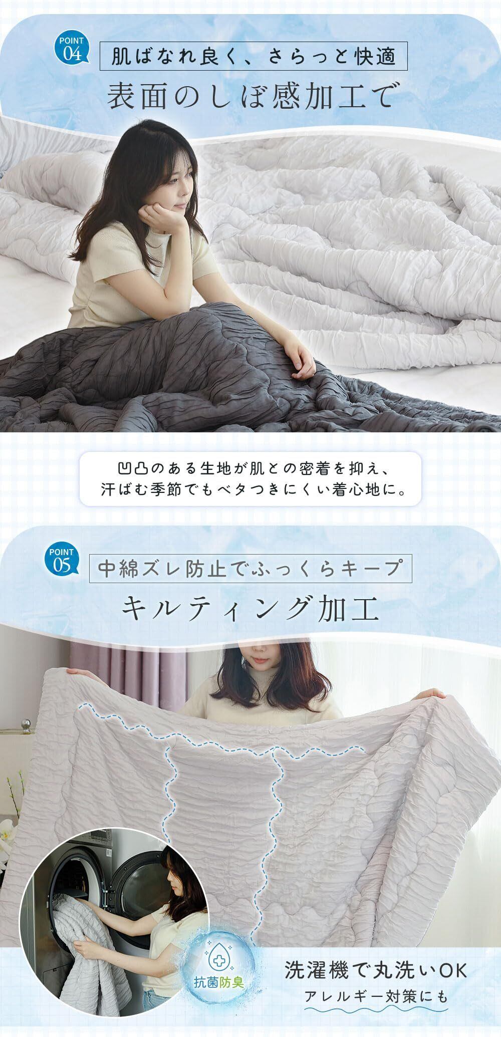 【除湿速乾&丸洗い可能】夏の寝苦しさの原因は温度だけでなく湿気も。VERILADYは特別な除湿速乾加工を施し、ムレを素早く解消。寝汗をかいてもサラッと快適な寝心地が持続します。 さらに、キルティング加工で中綿の偏りを防ぎ、ふっくら感を長期間キープ。 ご家庭での丸洗いも可能で、清潔を保ちながら冷感効果もそのまま持続します。