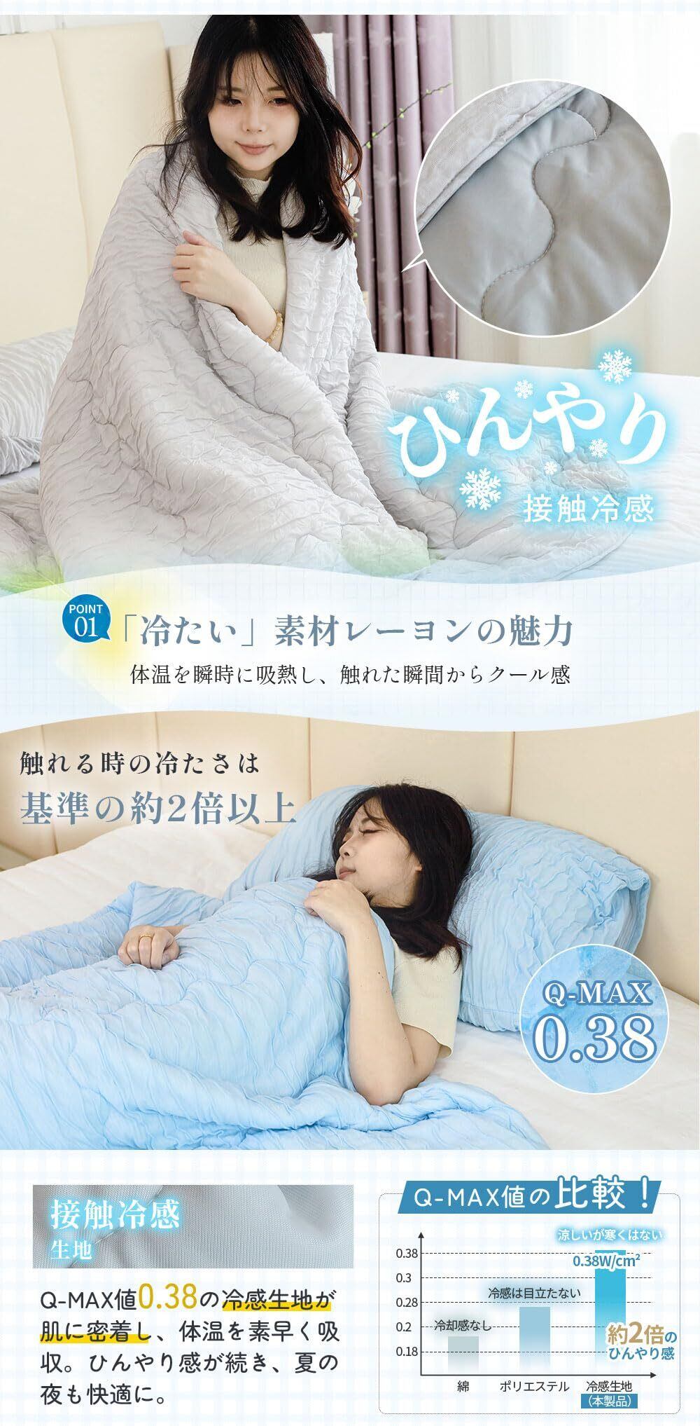 【究極のひんやり感、革命的な掛け布団の誕生!】 多くのお客様のご要望にお応えして、暑い夏の夜も快適に過ごせる、持続冷感設計の涼感ブランケットが登場!VERILADY冷感掛け布団は、Q-MAX値0.42の高性能冷感素材を採用し、肌に触れた瞬間から体温を素早く吸収し、ひんやり感が長時間持続。くしゅくしゅ加工により通気性がアップし、熱のこもりを防いで快適な睡眠環境を実現します。エアコンや扇風機との併用でさらに冷感アップ。エアコンの温度設定を抑えることで電気代の節約にも。軽やかでサラッとした肌触りが心地よく、蒸し暑い夏の夜でも快適にお休みいただけます。