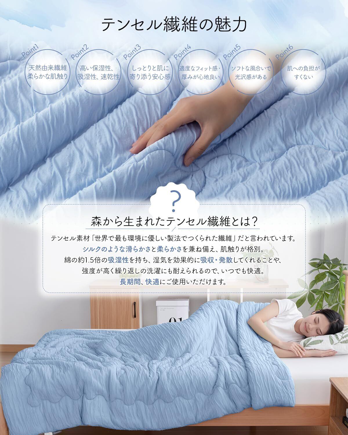 【SEK認証・抗菌防臭・防ダニ】テンセル繊維の柔らかさとともに、優れた吸湿性・発散性が快適さを引き立てます。抗菌防臭、ダニを防ぎ、嫌な臭いもシャットアウト。春·夏·秋·冬、どの季節でも心地よくお使いいただけます。